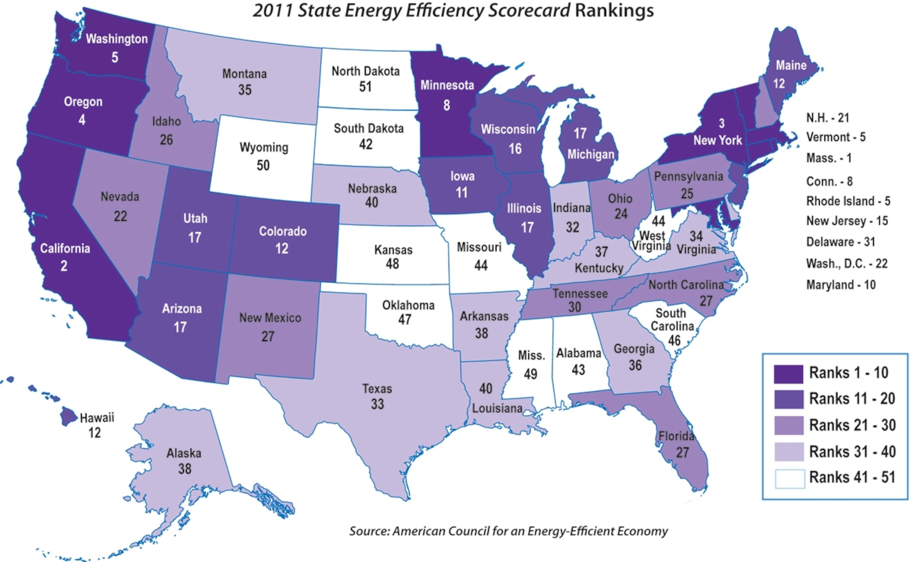 For the first time, Massachusetts came in at No. 1 on ACEEE’s 2011 State Energy Scorecard, which measures states’ efforts in areas such as utility programs, building and appliance standards, and transportation policies.