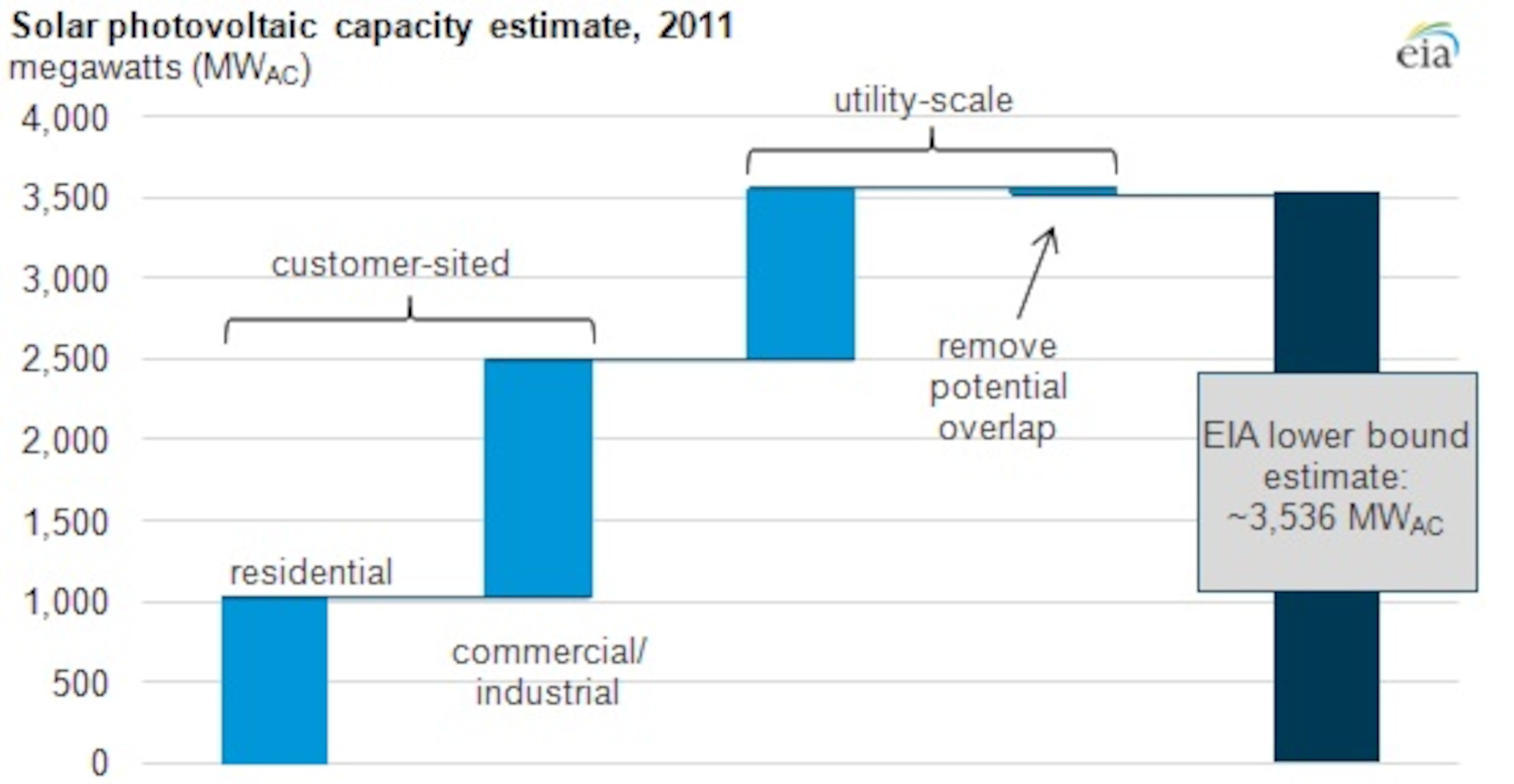 But the agency reported late last month a new estimate that attempts to include the under-1 megawatt systems it had been missing. The result isn’t a power generation figure like Mendelsohn came up with, but the EIA did arrive at a well-informed stab at the total grid-connected PV capacity in the country — 3,536 MW AC.