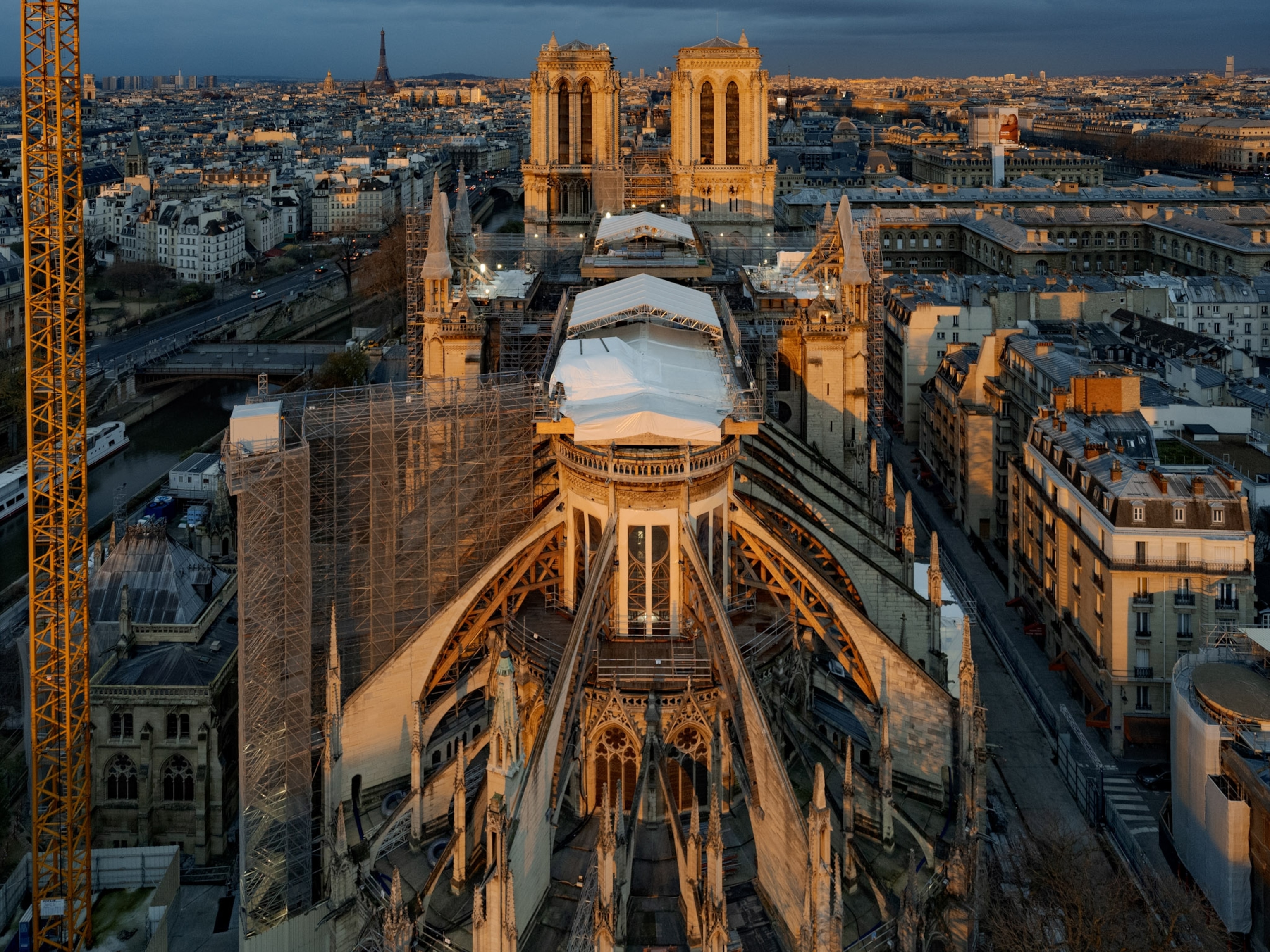 It was a gorgeous spring afternoon, five months before the construction site was opened to the public last October, when I went up into the scaffolding with Bottineau. A few miles south, at Notre Dame, crowds of tourists would be queuing on the plaza, waiting to get in. We looked down at the square in front of Saint-Denis: It was empty. On the stone pavement, a festive graphic in blue-and-white stencil outlined the shape of the missing steeple. Someday soon the new one will cast its shadow there when the sun rises behind it once again.