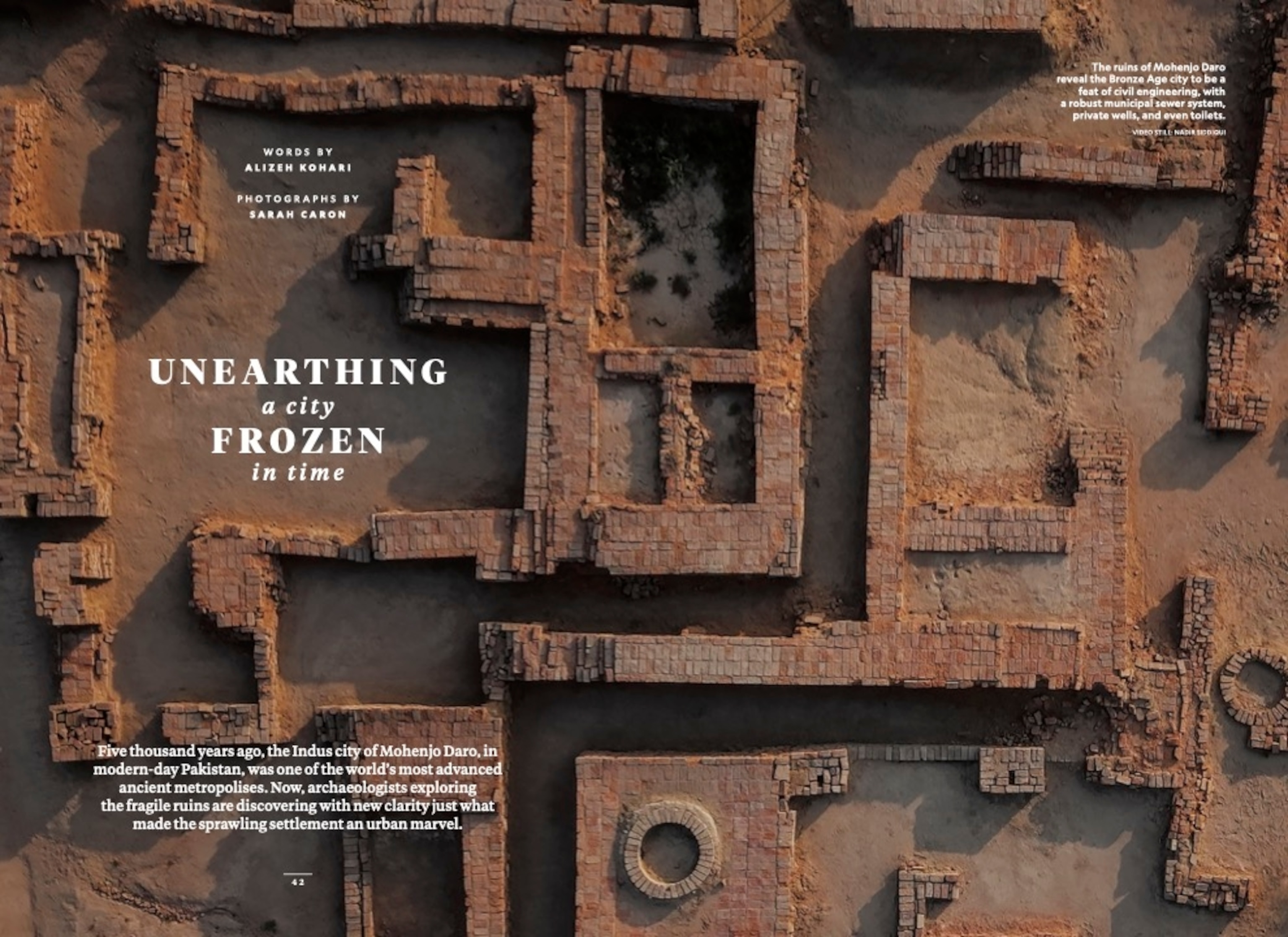 For this assignment, I worked with the acclaimed Pakistani filmmakers Haya Fatima Iqbal and Nadir Siddiqui, Oscar- and Emmy-award-winning documentarians who took on the challenge of chronicling the 4,500-year-old city in video through aerials and from the ground. The stunning visuals captured the site with such detail and perspective that a still frame from one of Nadir’s videos was included in the print magazine as the story’s opener. Haya and Nadir were on assignment with writer Alizeh Kohari and photographer Sarah Caron. Here, Nadir and Haya take us inside the monumental task of documenting the ancient city for National Geographic.