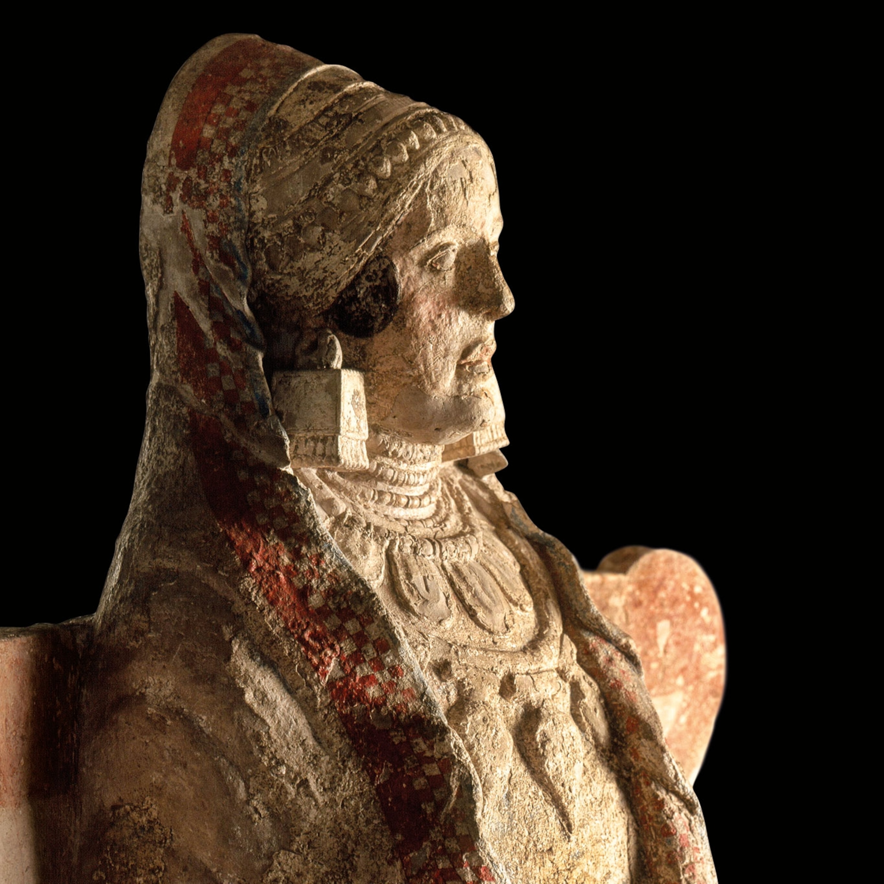 Scholars continue to debate the interpretation of this scene. The couple could be the tomb’s occupants or they might also be the gods of the underworld, Hades and Persephone, indicated by a tray of pomegranates, a food associated with the goddess.