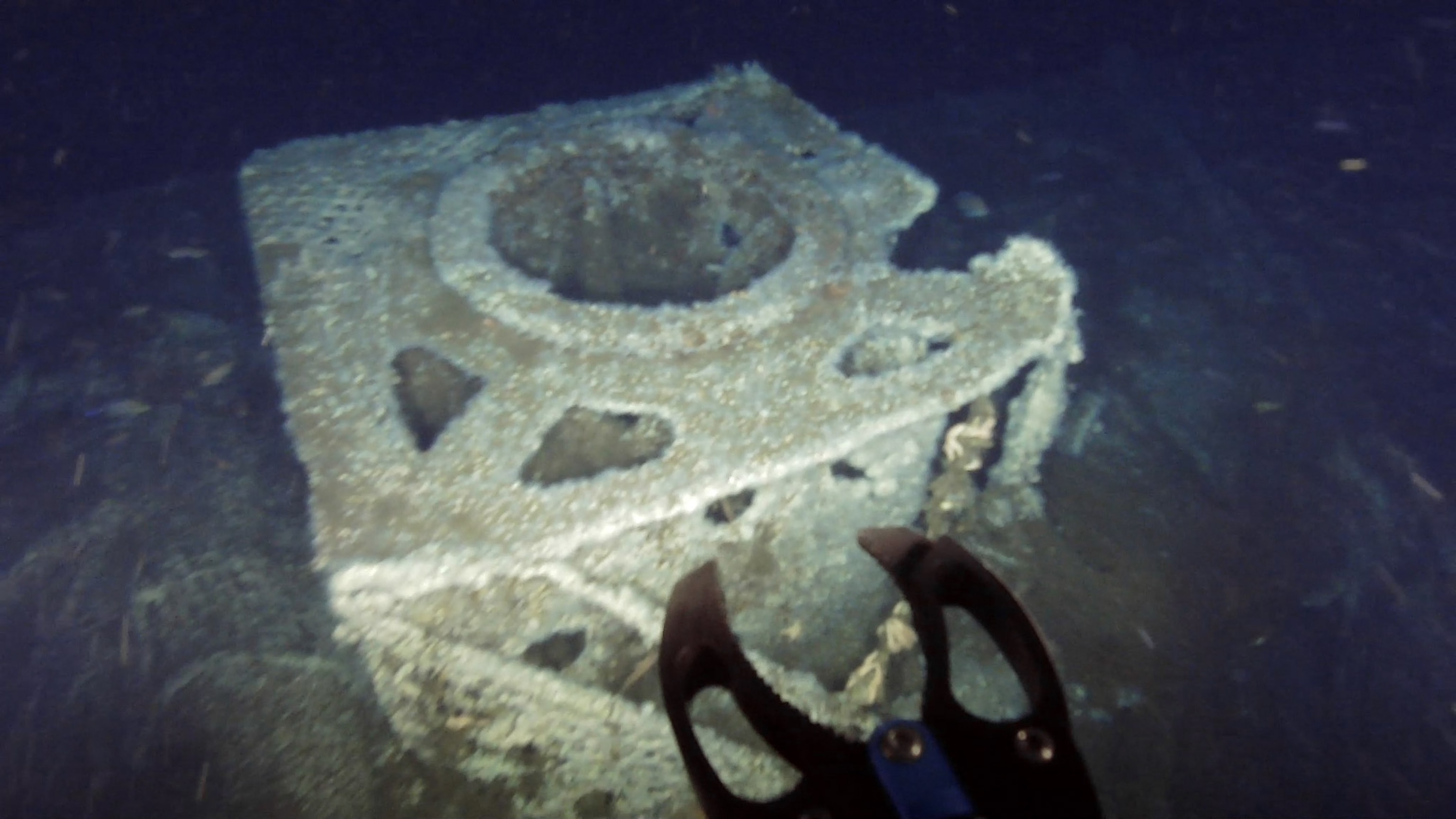 After several hours, Explorer arrived over the suspected wreck site and an ROV was dropped overboard. ROV pilot Ross Baxter navigated the tethered undersea robot using a laptop and repurposed video game controller. It wasn’t long before a ghostly object appeared on the screen.