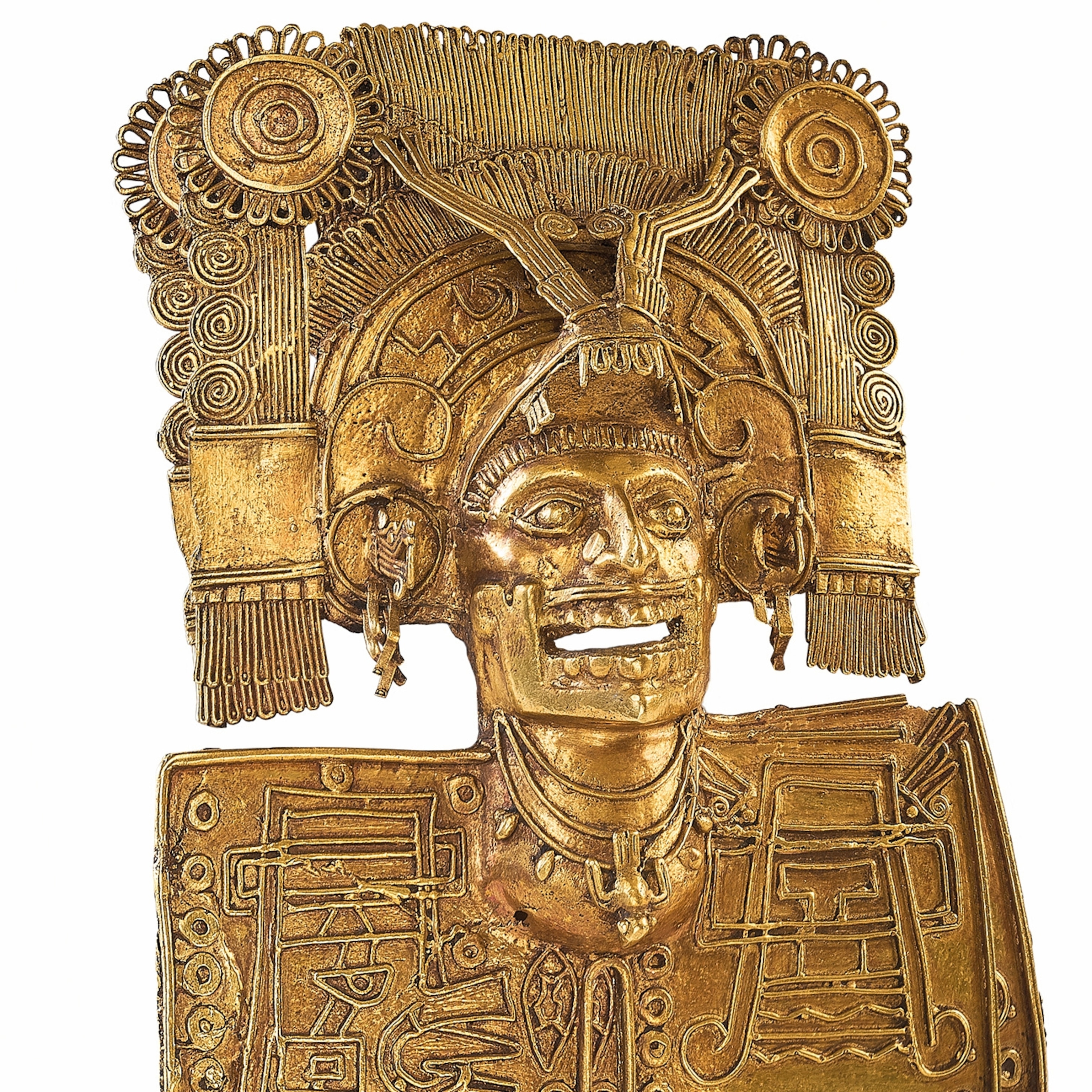 In his 1937 report Harvard archaeologist Samuel Lothrop identified the Sitio Conte people as one of the native groups the Spanish had encountered when they invaded Panama in the early 1500s. As the conquistadores marched across the isthmus, they wrote detailed chronicles of their progress. In the Sitio Conte region they found small, belligerent communities vying for control of the savannas, forests, rivers, and coastal waters. Their warrior chiefs covered themselves in gold to proclaim their rank as they fought each other and the Spanish. The conquistadores accumulated a fortune in gold for the royal coffers back in Seville as they defeated chief after chief. From one funeral alone they plundered 355 pounds of gold, including jewelry that they tore from the bodies of three chiefs who had been mummified over a smoking fire after falling in battle.