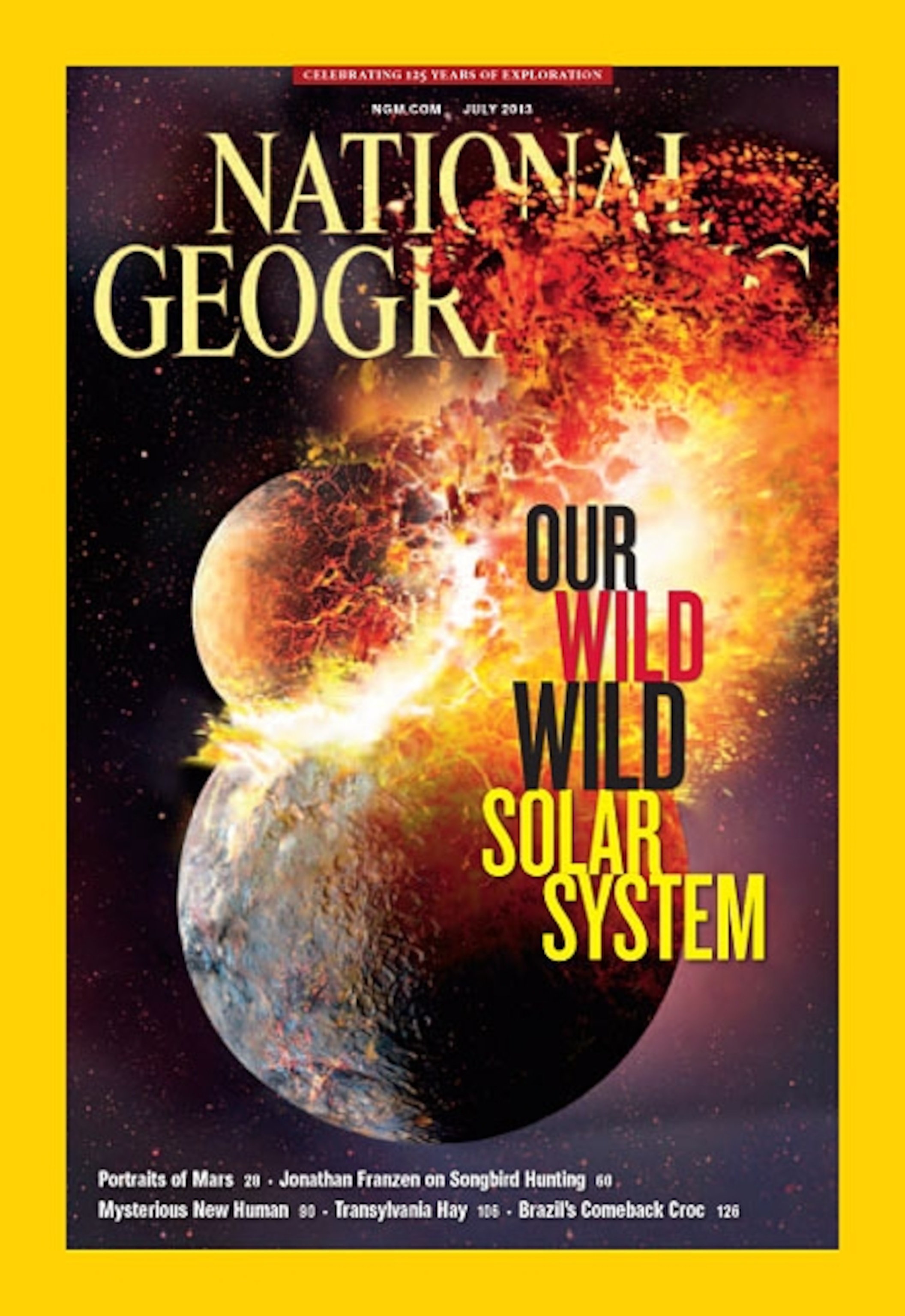 The July cover of National Geographic depicts a body the size of Mars slamming into the newborn planet Earth some 4.5 billion years ago. A cosmic crash like this, according to a now widely accepted theory, blasted molten rock far into space and spawned something familiar: our moon, creator of tides.