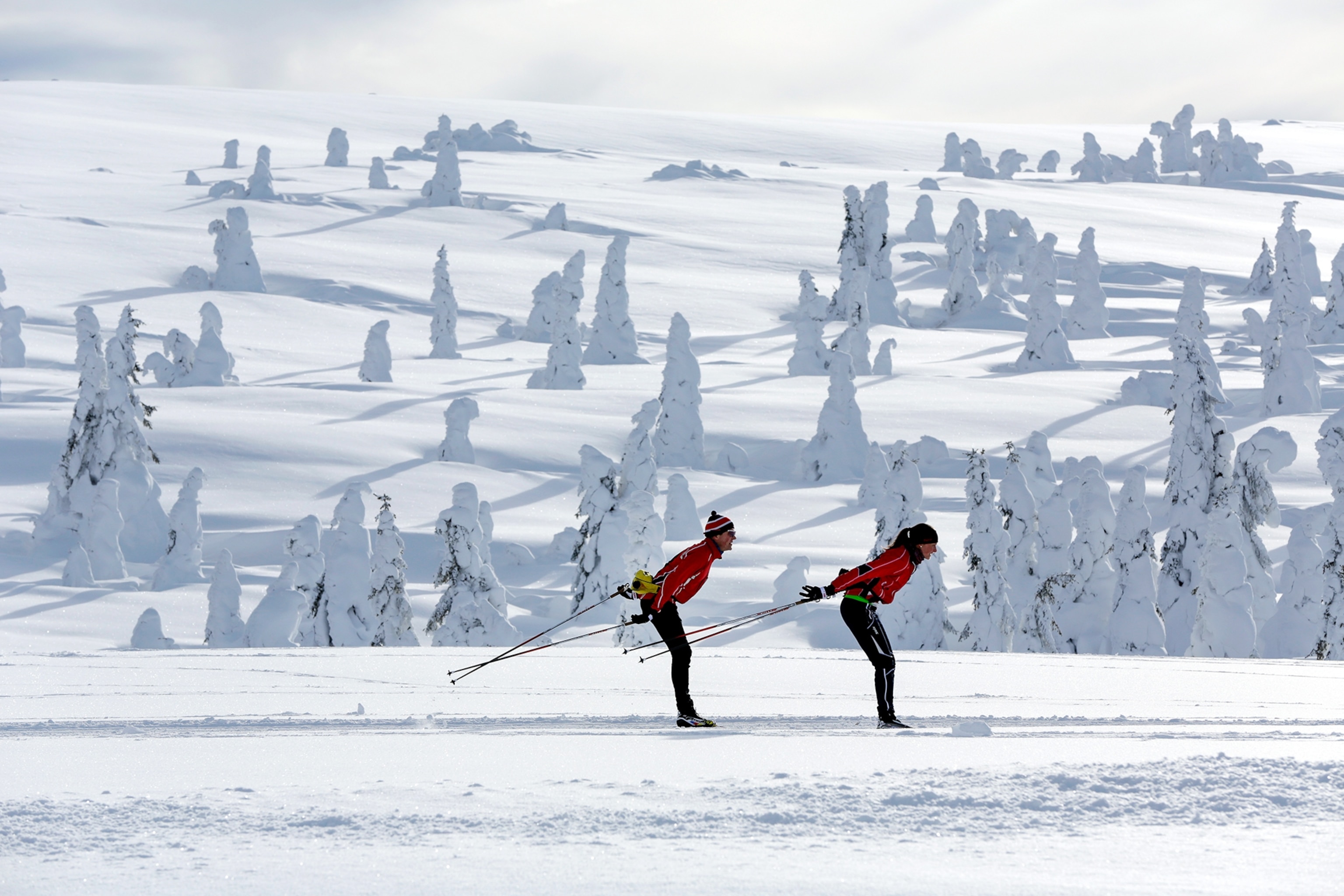 Norwegians feel a deep connection with the landscape and take any opportunity to experience it, like this couple cross-country skiing.