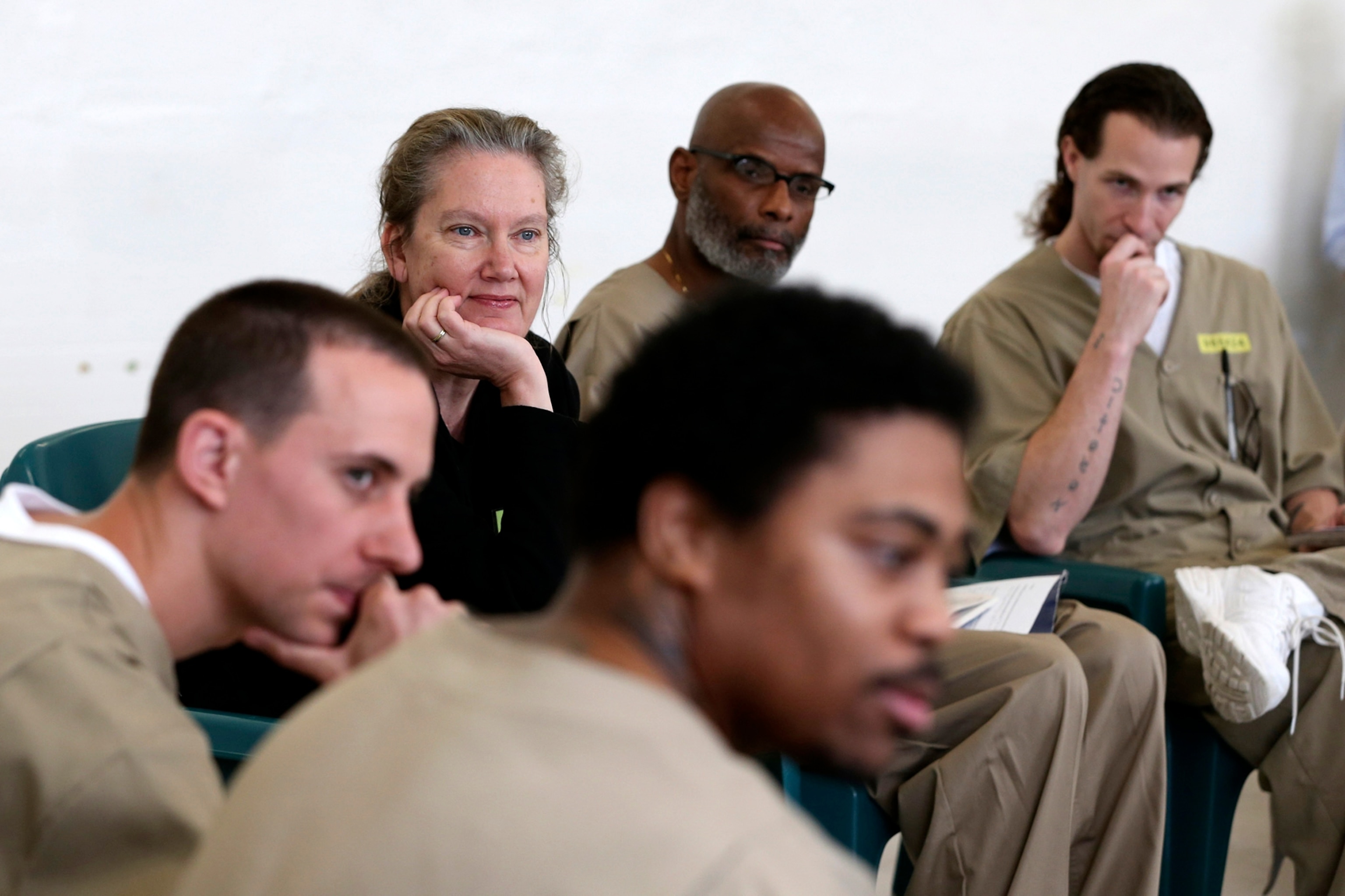The men sit in a semicircle, facing a chalkboard and two visitors. One is the instructor, a gray-bearded man with glasses. The other is a guest speaker: a tall woman in her mid-50s with keen blue eyes and flaxen hair streaked silver. This is her first time in Pendleton. But she knows one of the inmates, kept in another part of the prison, very well.