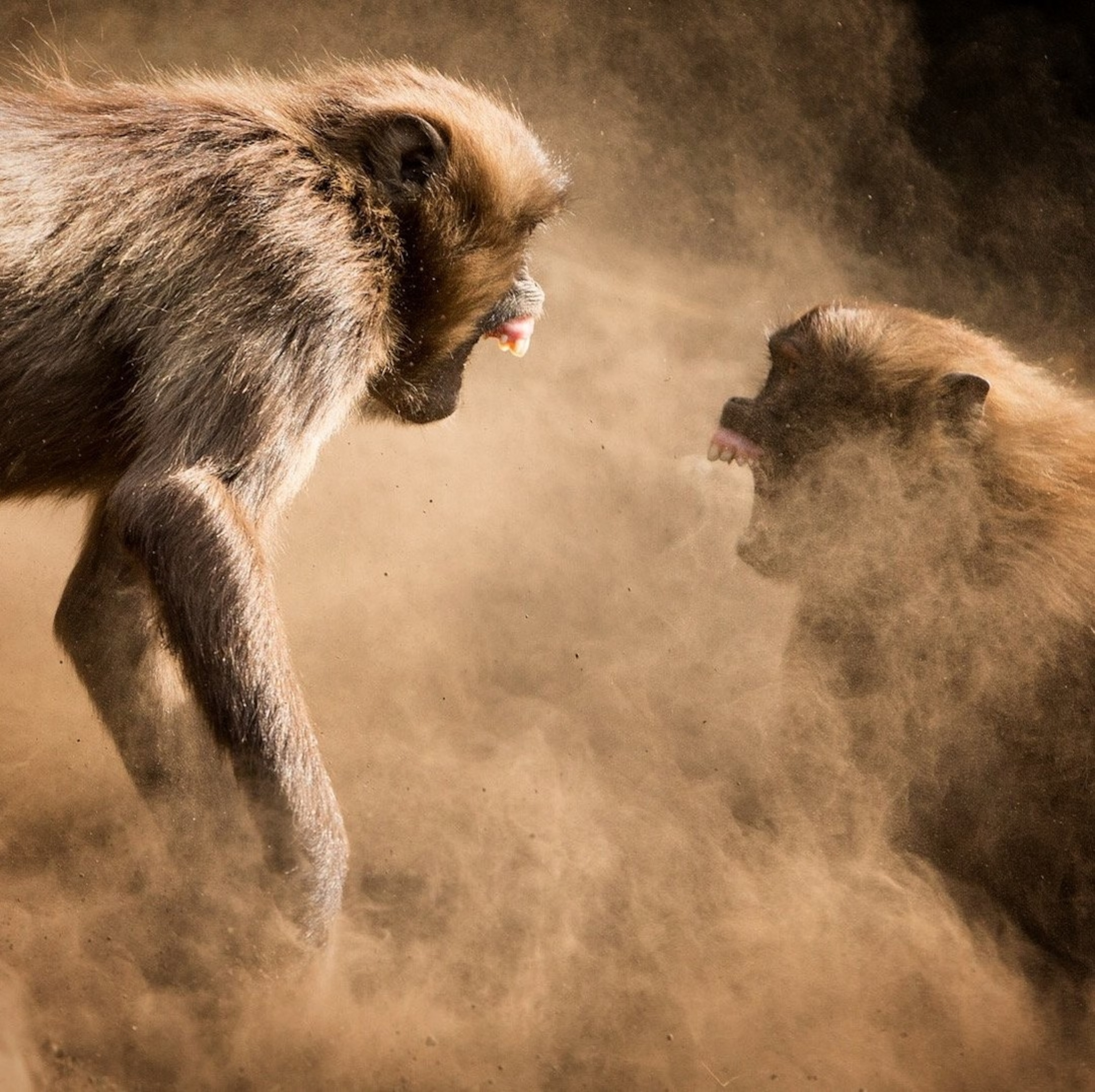 Morning workout: For two years, photographer Trevor Frost documented gelada monkeys in the highlands of Ethiopia. “Each morning the juvenile monkeys would wrestle and play in this dirt pit,” Frost says, “so I sat in there daily for a week trying to get photos of the action. While the play fighting looked intense, it was not violent, and no geladas were hurt.”