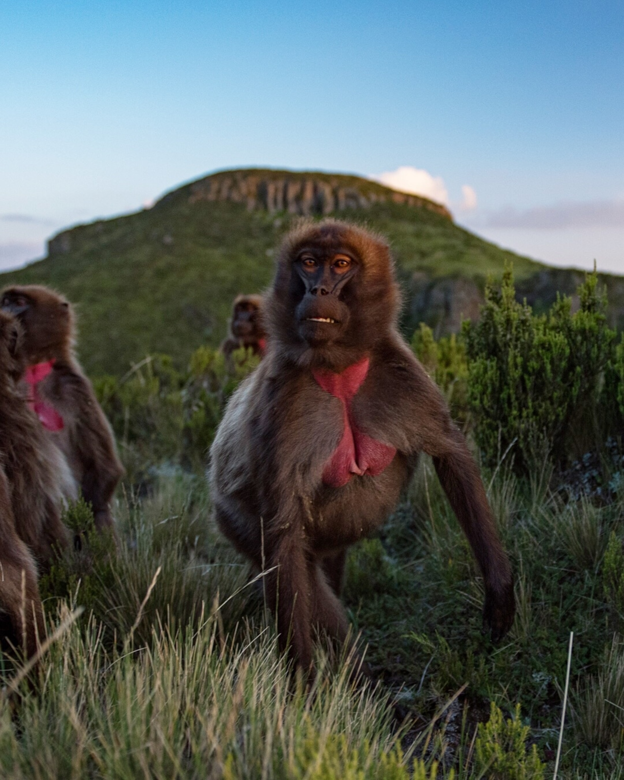 Photographer Jeff Kerby took this image of a gelada monkey in the highlands of central Ethiopia. “I spent many evenings with these gelada monkeys as they waited above their sleeping cliffs,” Kerby said. “After a busy day of eating grass, they would often rest, groom, and sometimes fight” until sunset.