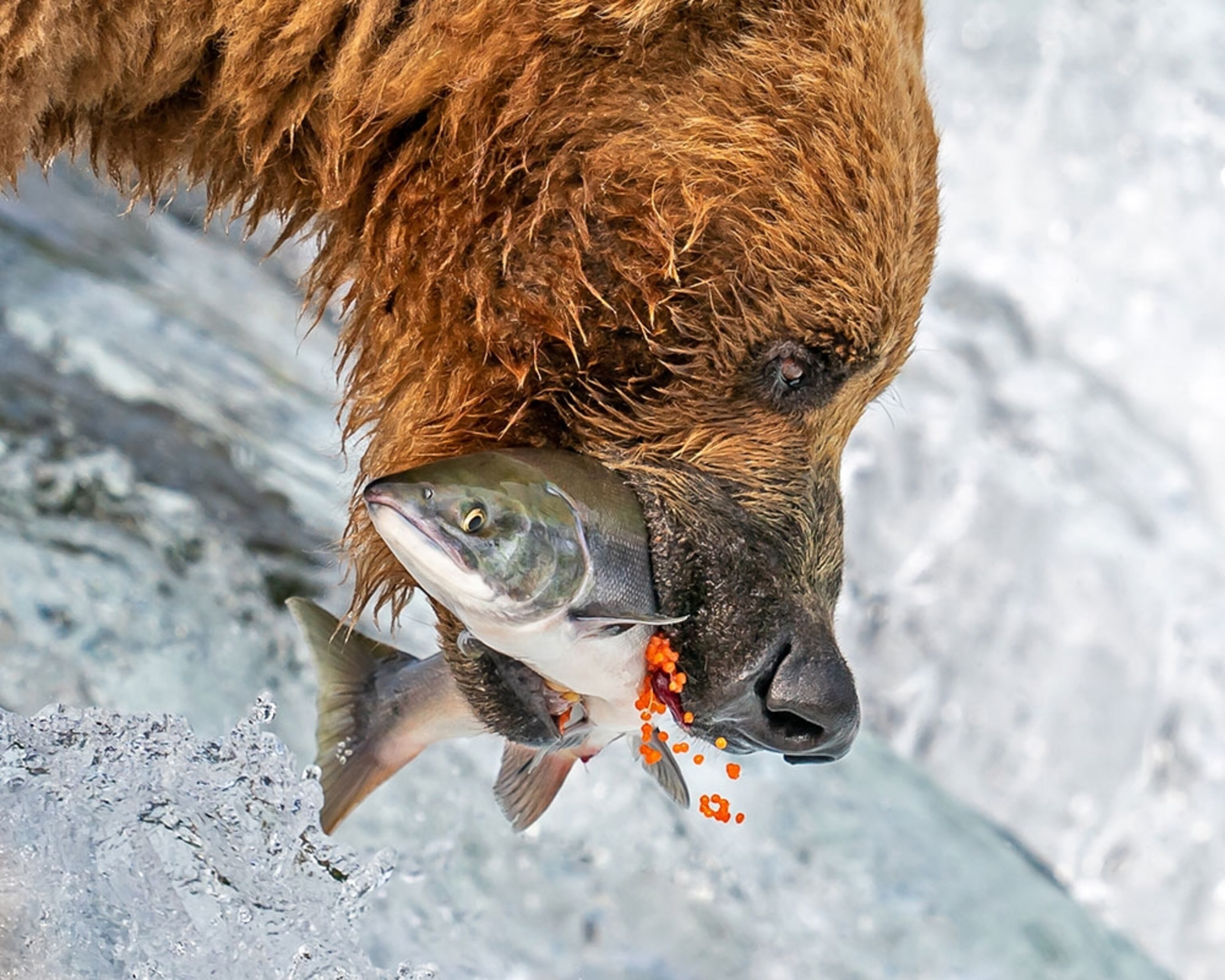 Brown bear, brown bear: Coastal brown bears are among the many obstacles that salmon face on their way to spawn. This salmon was snatched from the river in Alaska’s Katmai National Park and Preserve, and the bear’s tight grasp caused the salmon to release its eggs.
