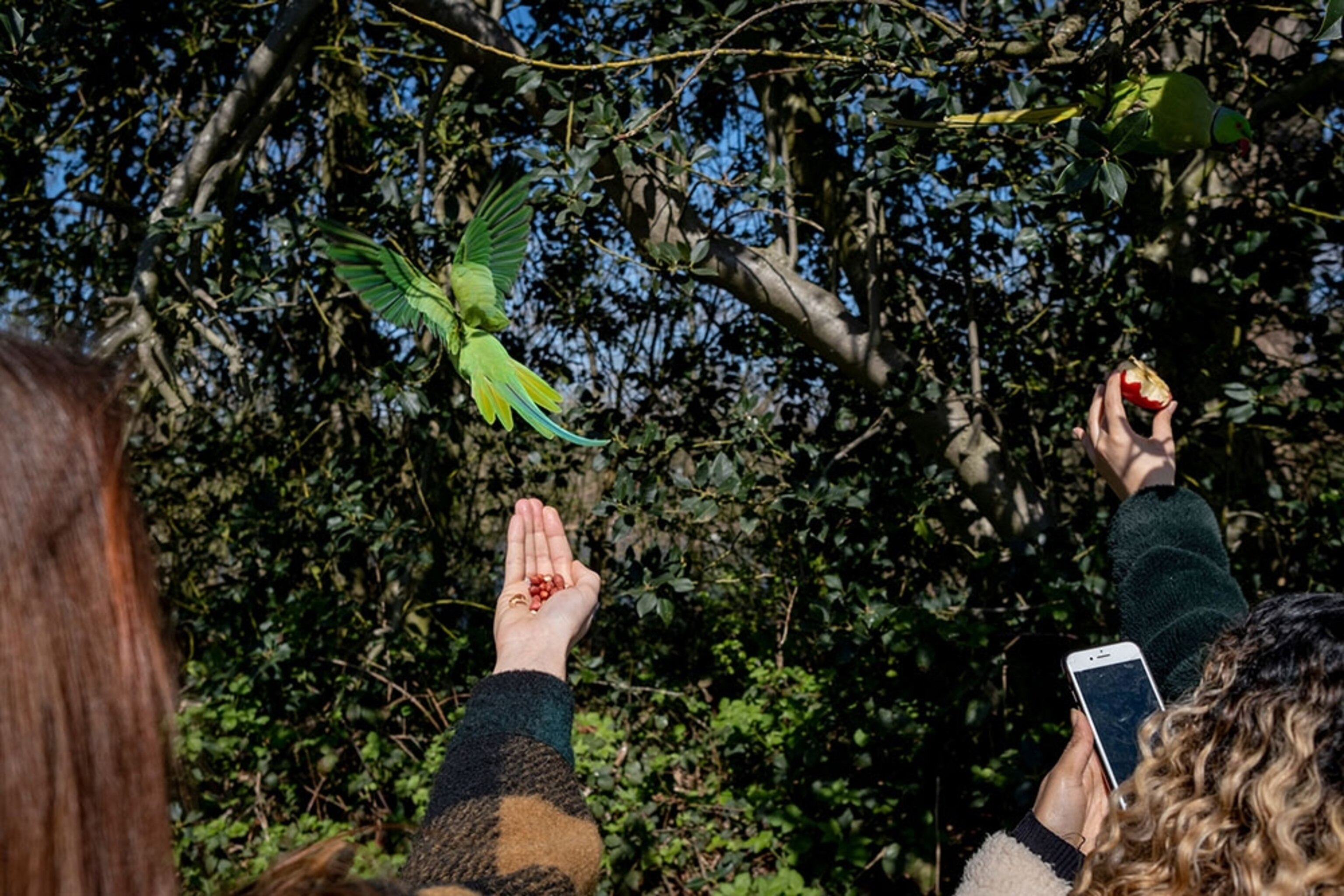 Flashes of dazzling color punctuate the gray drizzle of London’s winter sky. Sparks of neon green—parakeets—are adorned with lipstick-red beaks. The males sport thin “necklaces” of black feathers.