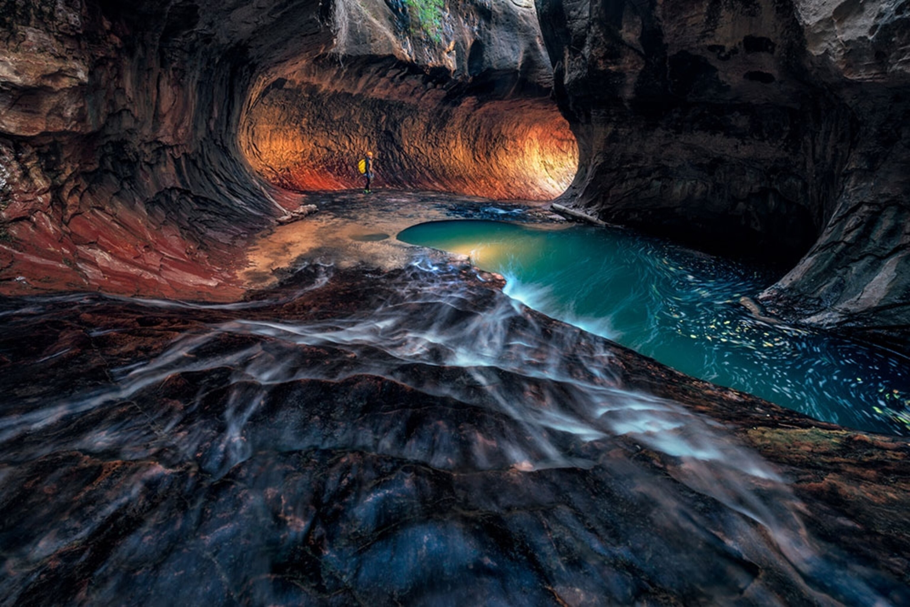 Otherworldly? That’s a common view of the narrow canyons, mesas, and rock formations of Utah’s Zion National Park. The human history of this 148,732-acre park dates back some 10,000 years, and it is easy to feel contemplative there, Norie Quintos writes in the June issue of National Geographic. She quotes author and environmentalist Terry Tempest Williams as saying: “Every pilgrimage to the desert is a pilgrimage to the self. There is no place to hide, and so we are found.” (Pictured above, an adventurer navigates through a narrow canyon at Zion.)