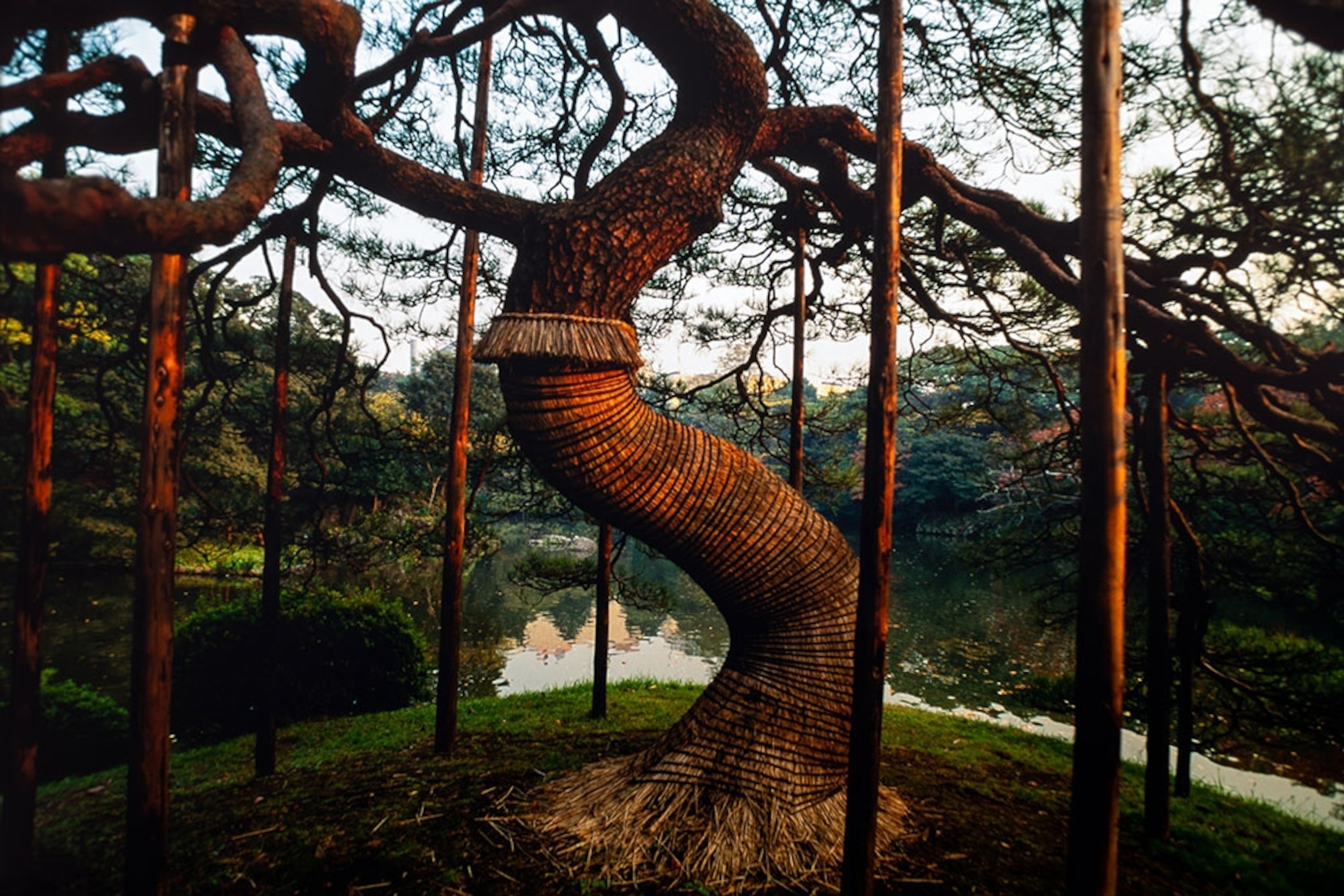 Winterized: The weather in Japan reaches extremes, from hot, humid summers to frigid, icy winters, and for centuries gardeners there have employed beautiful yet practical ways to protect trees from the harshness of winter. Transforming trees into sculptural objects through yukizuri–the art of supporting tree limbs against the weight of heavy wet snow with artfully tied ropes–is an annual ritual. Tree trunks are protected by kokomaki–wraps made of straw. It’s an organic form of pest control that creates a cozy spot for the pine moth (in its caterpillar stage) to roost for the winter, rather than hibernate under fallen leaves. In spring, gardeners collect and burn the wraps filled with still-groggy caterpillars before they are able to gobble up the pine needles and damage the tree.