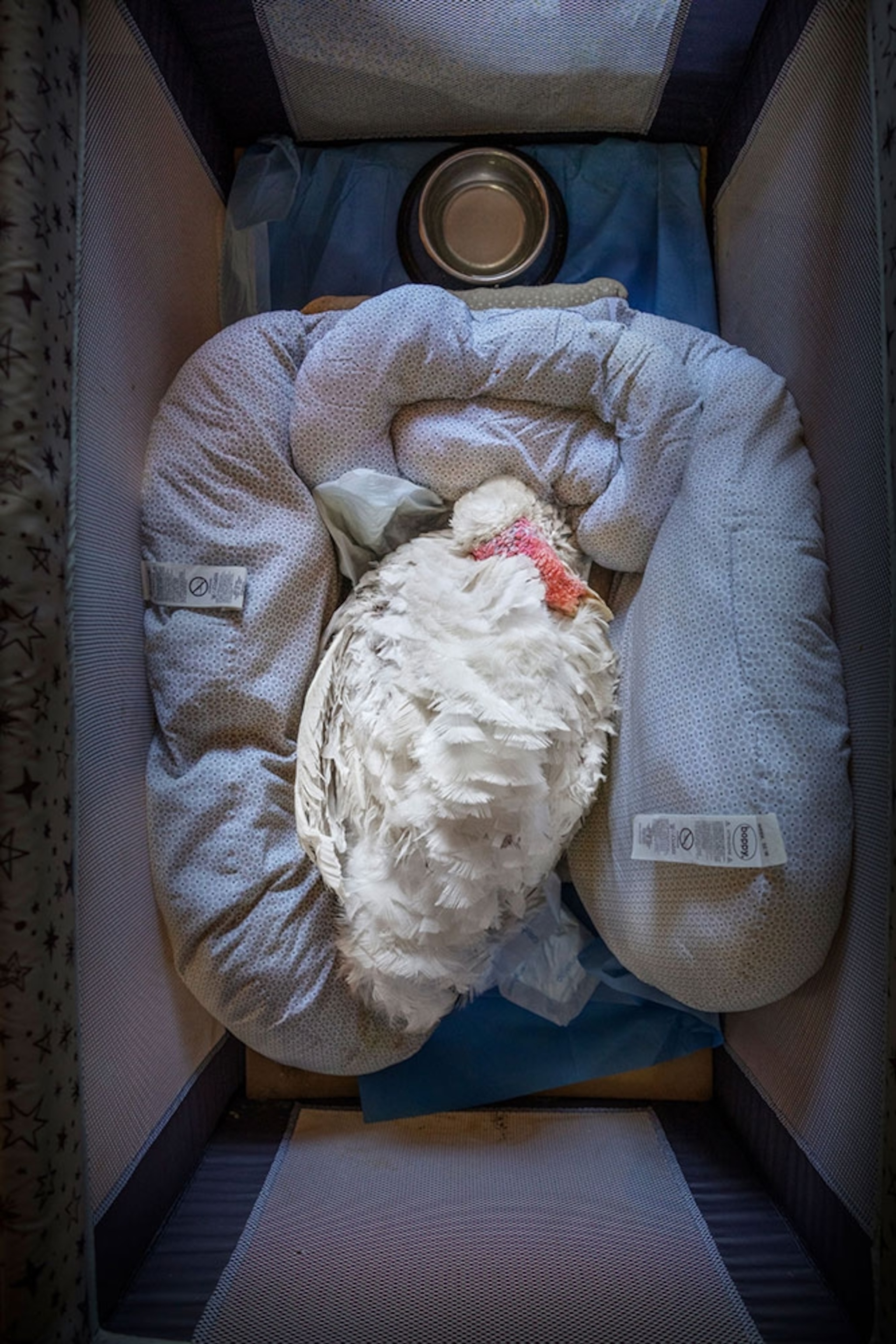 Saved from a dumpster: Patri, a turkey at El Hogar, rests in a crib, surrounded by pregnancy pillows and cushions to prevent pressure sores. Originally rescued from a dumpster outside of a turkey farm, Patri has an incurable joint disorder that leaves him unable to walk. The turkey also spends time hanging from a custom-made swing, so that Patri can stretch its legs.