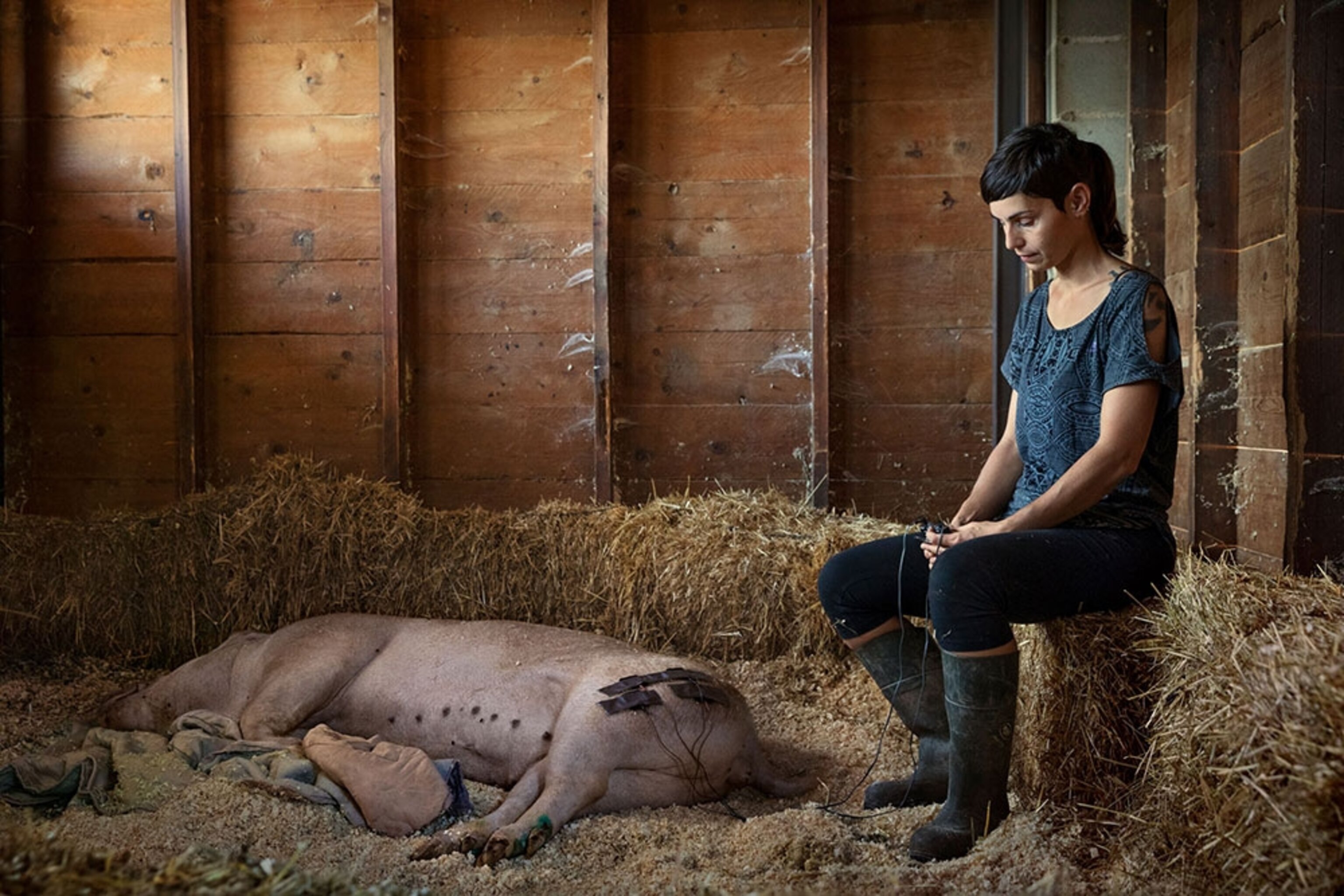 Helping the stricken: Olivia Gómez treats a pig named Paola with electrotherapy. Santuario Gaia rescued Paola in November 2019, after it was abandoned outside of a farm when other pigs were taken to a slaughterhouse: Paola had a broken vertebra and couldn’t walk onto the transport truck. Veterinarians at Gaia worked to heal her spine, and Paola can now stand and take a few steps.