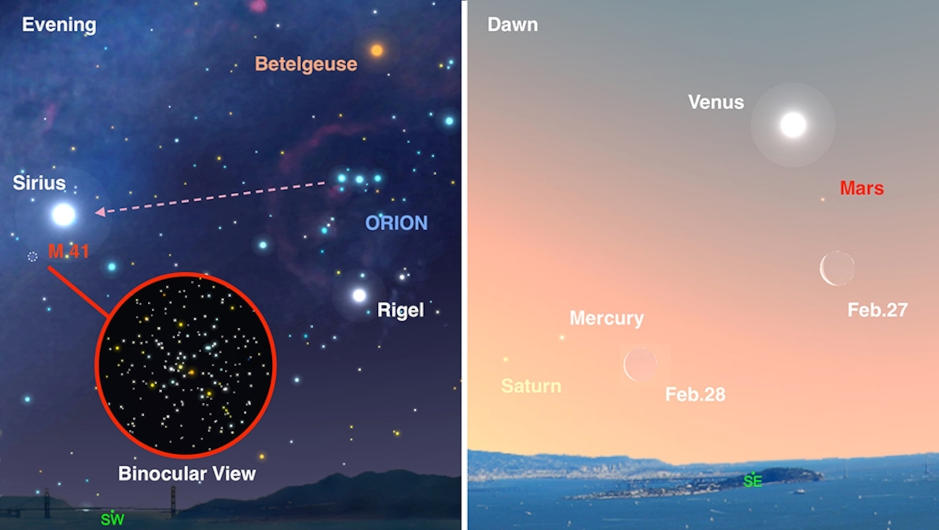Celestial cluster hunt: Without the moon in the evening skies this week, why not chase down a bright open star cluster? Bright star cluster Messier 41 includes about a hundred stars bright enough to be seen by the naked eye. Start your hunt at Orion’s belt. Extend a line from those three stars in the famed constellation to Sirius, the brightest star in the sky. About the size of four full-moon disks to the south sits Messier 41. Then, at dawn on Sunday, look southwest to catch the crescent moon forming a line with Venus and Mars. The next morning, see the moon with Mercury and Saturn closer to the horizon. Want more about moons? Check out this article on the moons in our solar system. — Andrew Fazekas