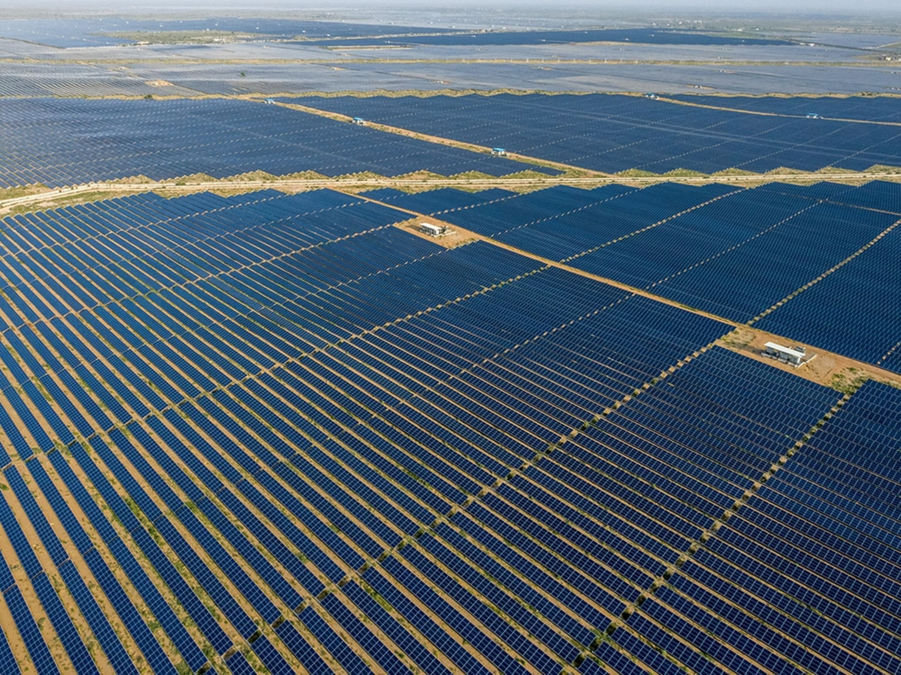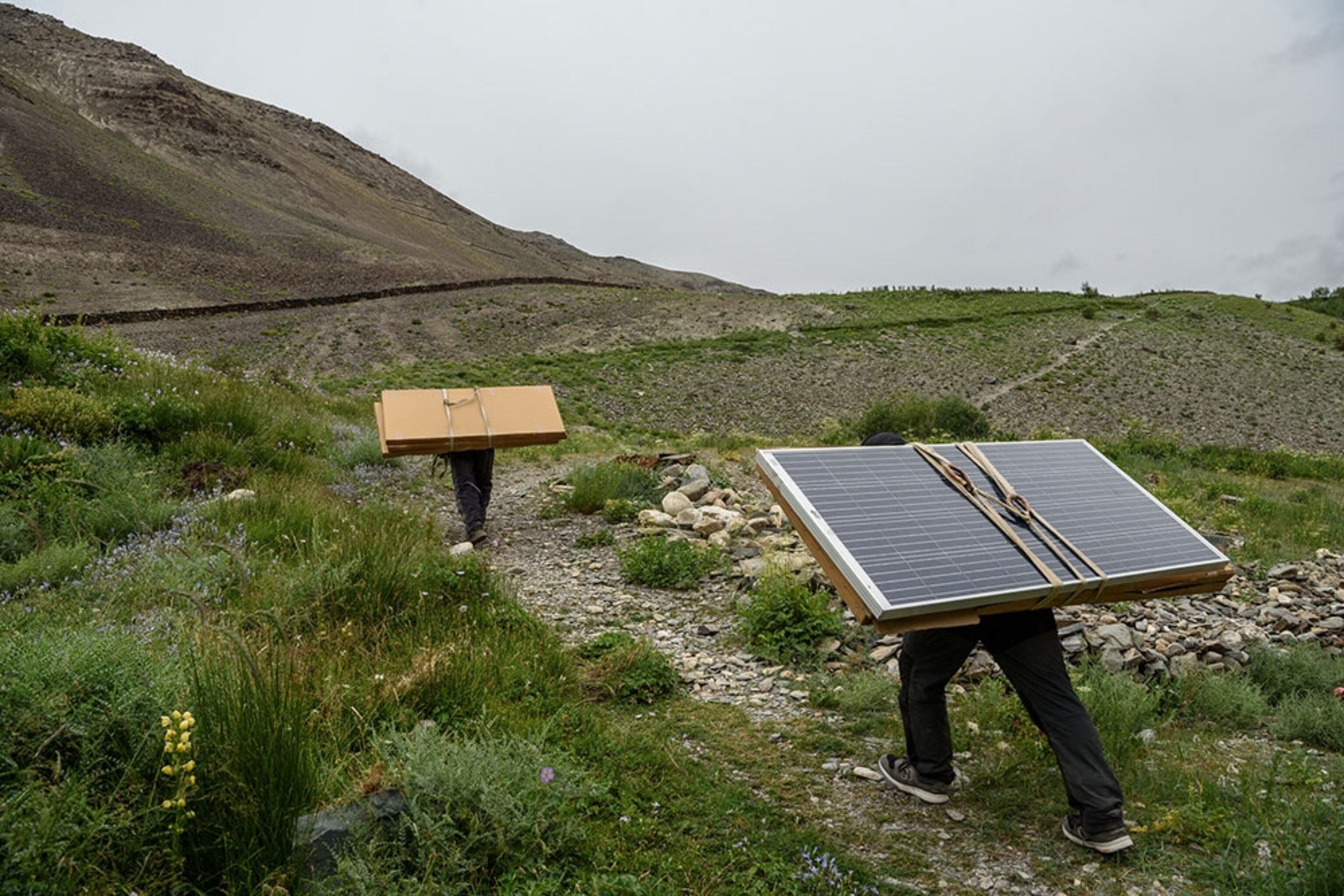 Two photographs by Saumya Khandelwal tell the story. In the first (above), two men are walking up a stony trail in the Himalayas with solar panels strapped to their backs; they’re headed for the village of Yal, which has no reliable electricity. In the second photograph (below), taken from a drone, row upon row of solar panels stretch to the horizon across a plain in Rajasthan. This is Bhadla Solar Park, which with a capacity of more than 2.2 gigawatts is the largest in the world.