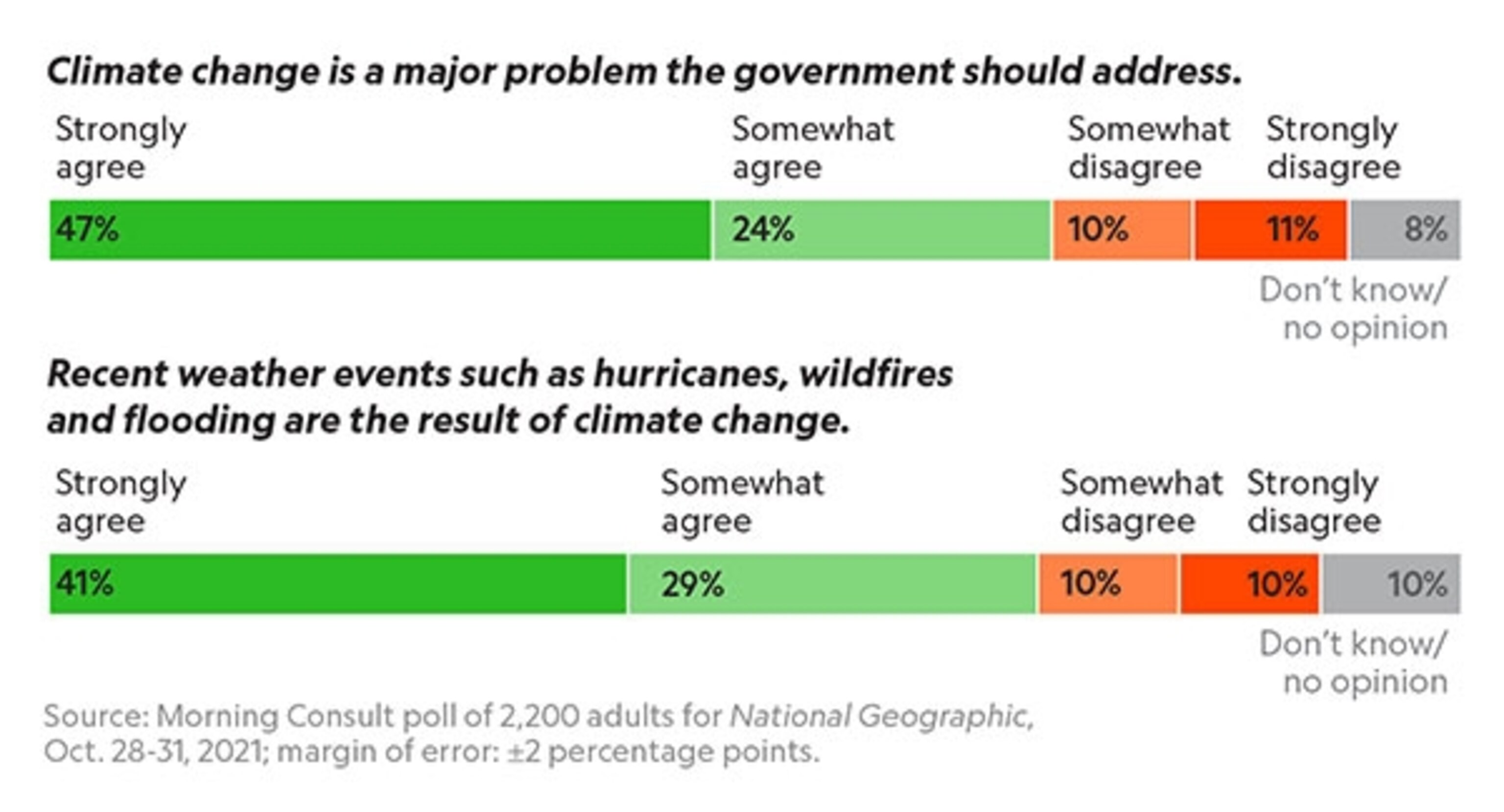 We asked, you answered: Should government intervene to seek to slow climate change? Do you believe weather extremes and natural disasters have increased because of climate change? As world leaders work through broad climate issues in Glasgow, most of 2,200 Americans polled by Nat Geo and Morning Consult agree strongly with both questions (pictured above)—and 3 of 4 agree with scientists that climate change is happening. Most readers writing in after we asked these questions in last week’s newsletter are, if anything, more emphatic. “We need leaders who can help people see we are part of an ecosystem no matter what country we live in and that taking care of that system is what’s important,” writes Karen Brown. Government, writes John Ozmun, “is the only entity with scale to effectively communicate the issue and marshal the resources and incentives that will be required to drive actions to slow climate change.”
