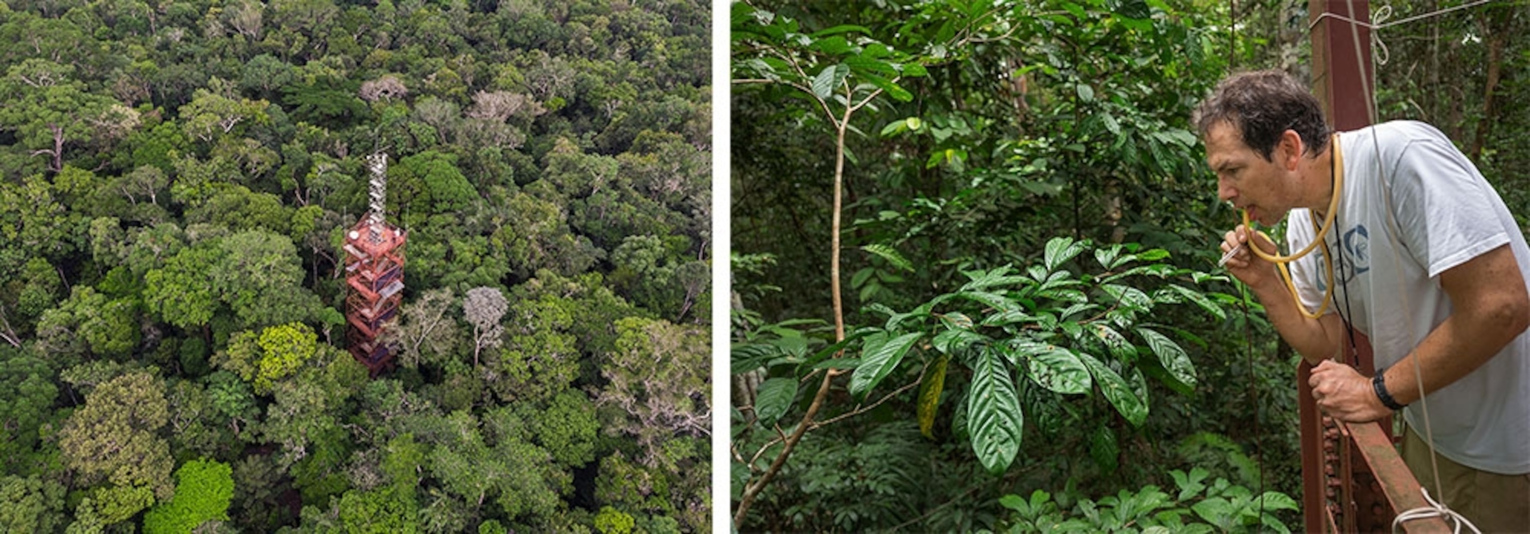 Changing it up: Instead of studying life on the ground, these entomologists looked at insects along different levels of the research tower, at left. Above right, Brian Brown prepares to suck a phorid fly into a tube to study. He has spritzed leaves with diluted honey to attract the flies—and the bees they attack. “How many people,” he asks, “would voluntarily sweat in the forest surrounded by bees and wasps?“