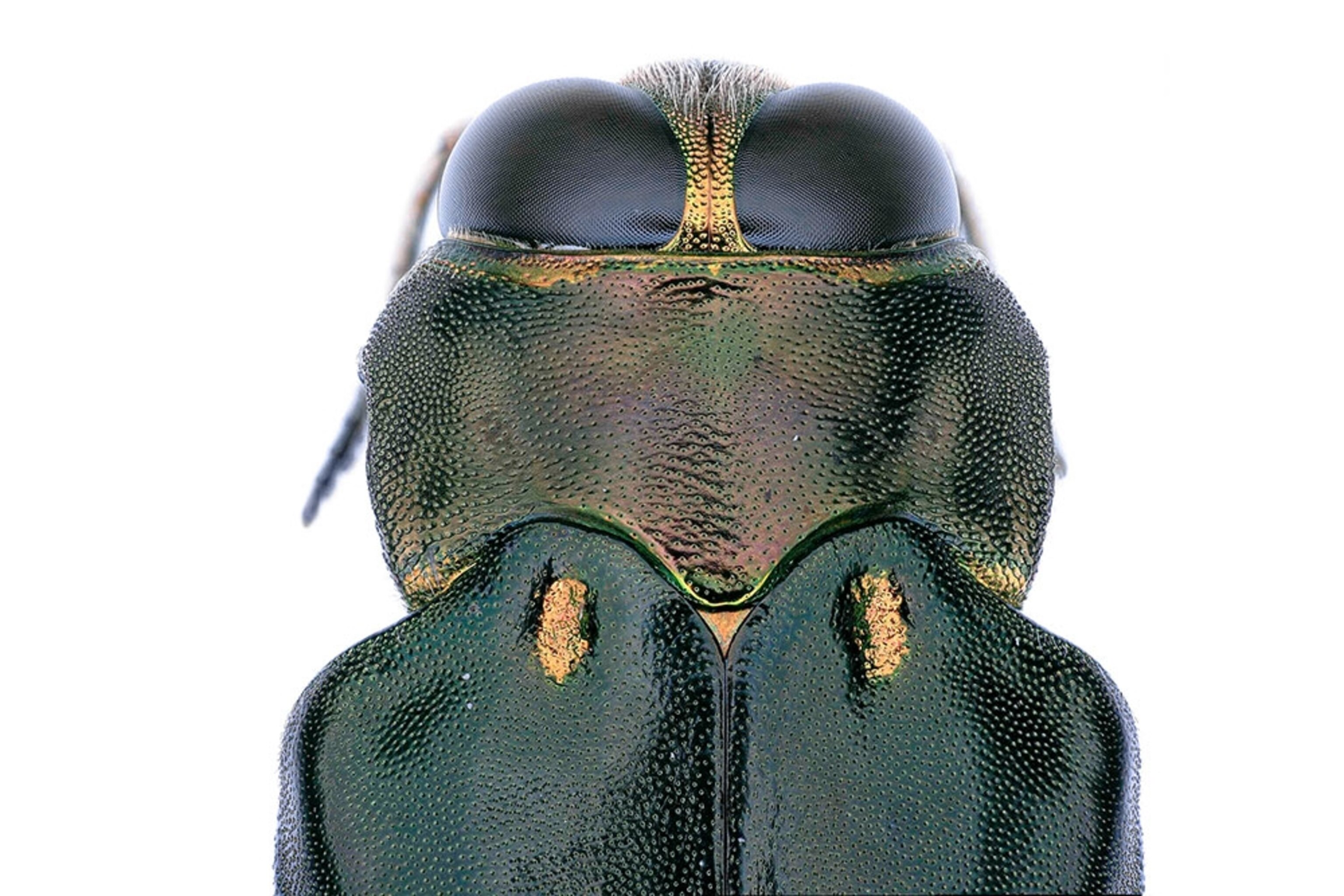 Pictured above is an iridescent orchid bee, a tropical cousin of the bumblebee and honeybee. Read on to see, very close up, the beauty of a chalcidid wasp, a jewel beetle, and a weevil.