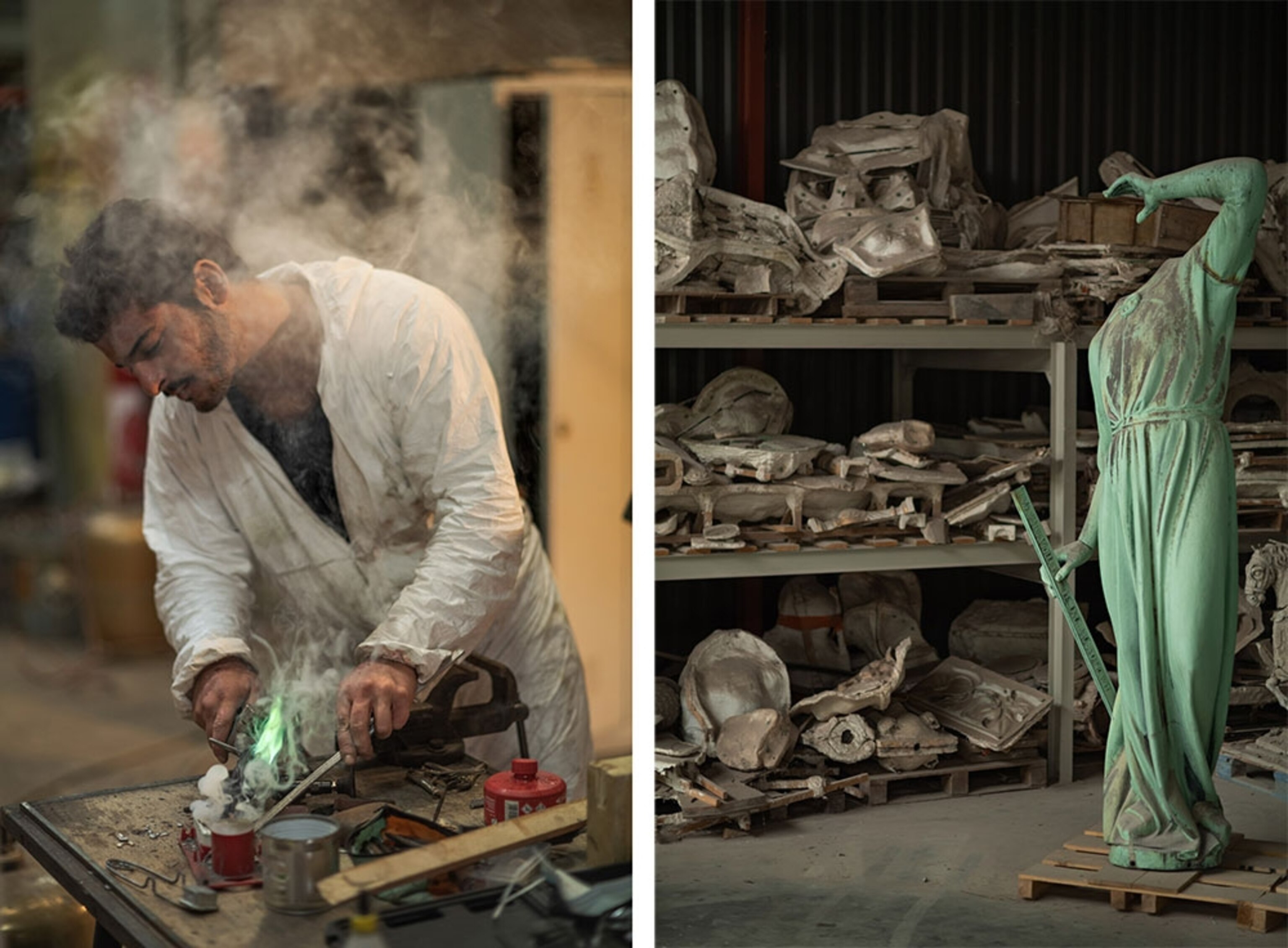 (Pictured, at top, a crane carries workers from the roof of the complex. Above left, technician Thomas Pagès restores a copper statue of St. Philip, which along with statues of the other apostle by chance were removed from the spire four days before the fire. Above right, the heads of the statues were taken off before their removal from the roof.)