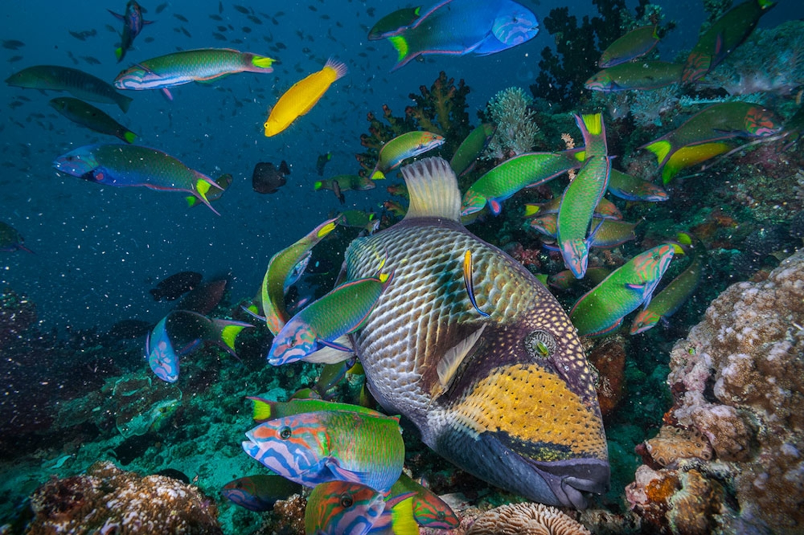 Trying to save the young: A titan triggerfish, exhausted after battling to defend the eggs in its nest, lies down in a last attempt to save its young from moon wrasses. The robust corals on this reef attract a stunning array of sea life.