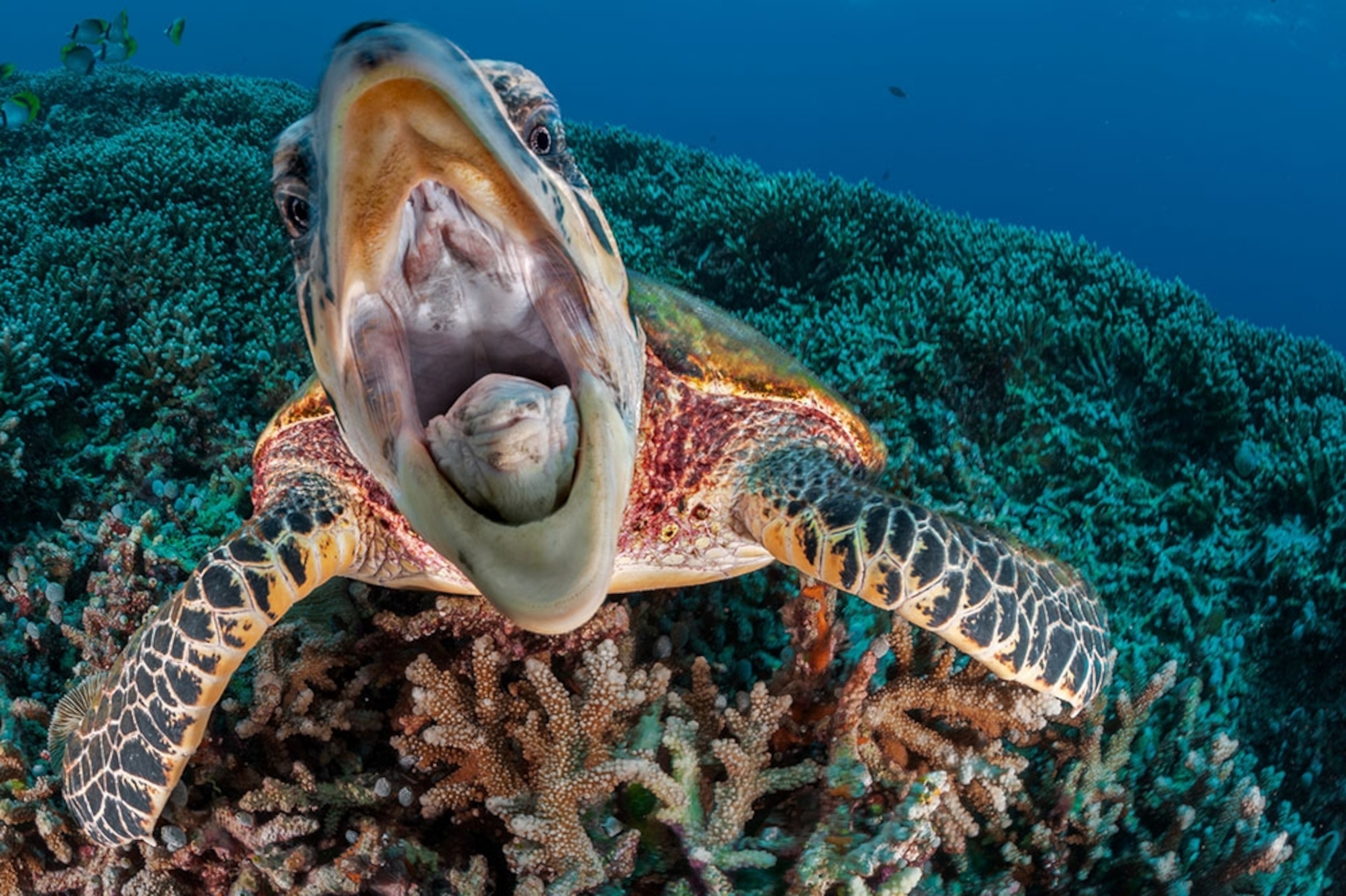 Dinner interrupted: A hawksbill turtle stops eating sponges to confront its reflection in the lens. The turtle finds the sponges tucked under coral.