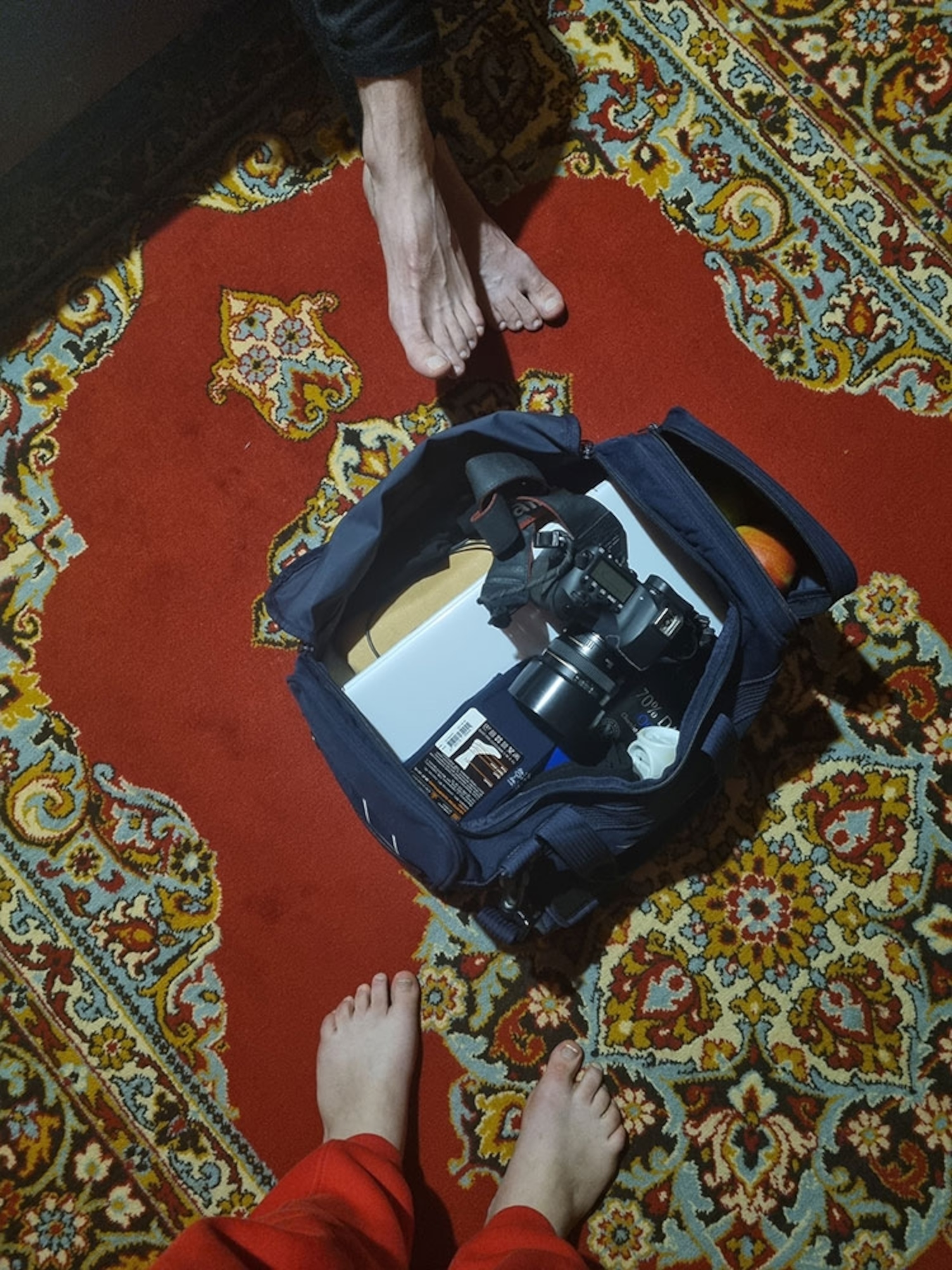 On Friday, after explosions in Kyiv, she set off west in a caravan of seven cars. By Sunday she was safe, for now, near the western border. “I have no clothes, little money,” she told Nat Geo’s Whitney Johnson. “I grabbed only a camera and a bag with documents. I’m starting a new life from zero. There is me, a tracksuit on me, a camera, and my fiancé.” (Pictured above, the bag.)