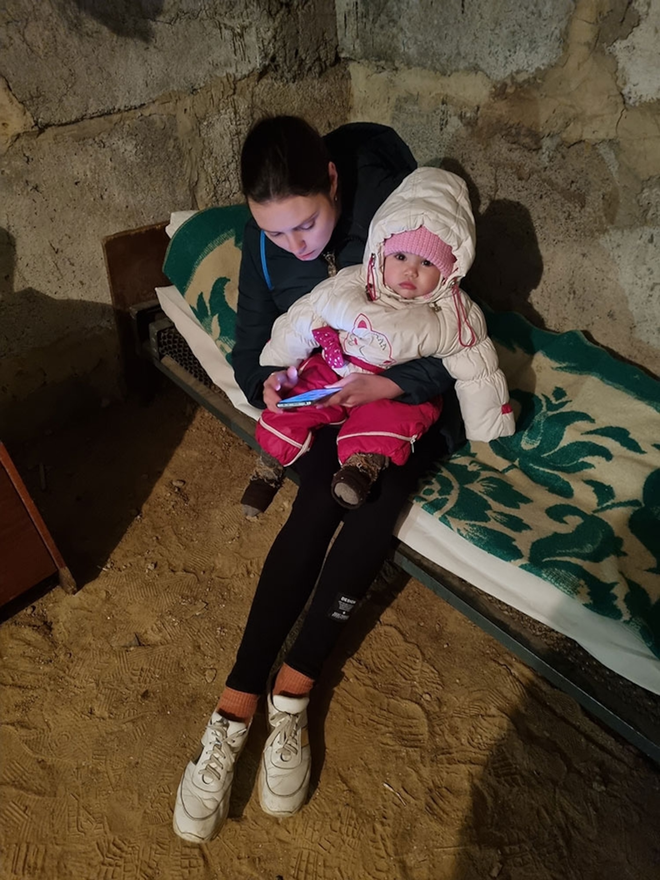 In the bomb shelter: A Ukrainian woman named Maria, a friend of the photographer‘s sister, is holding a baby while waiting for the missile threat to end.