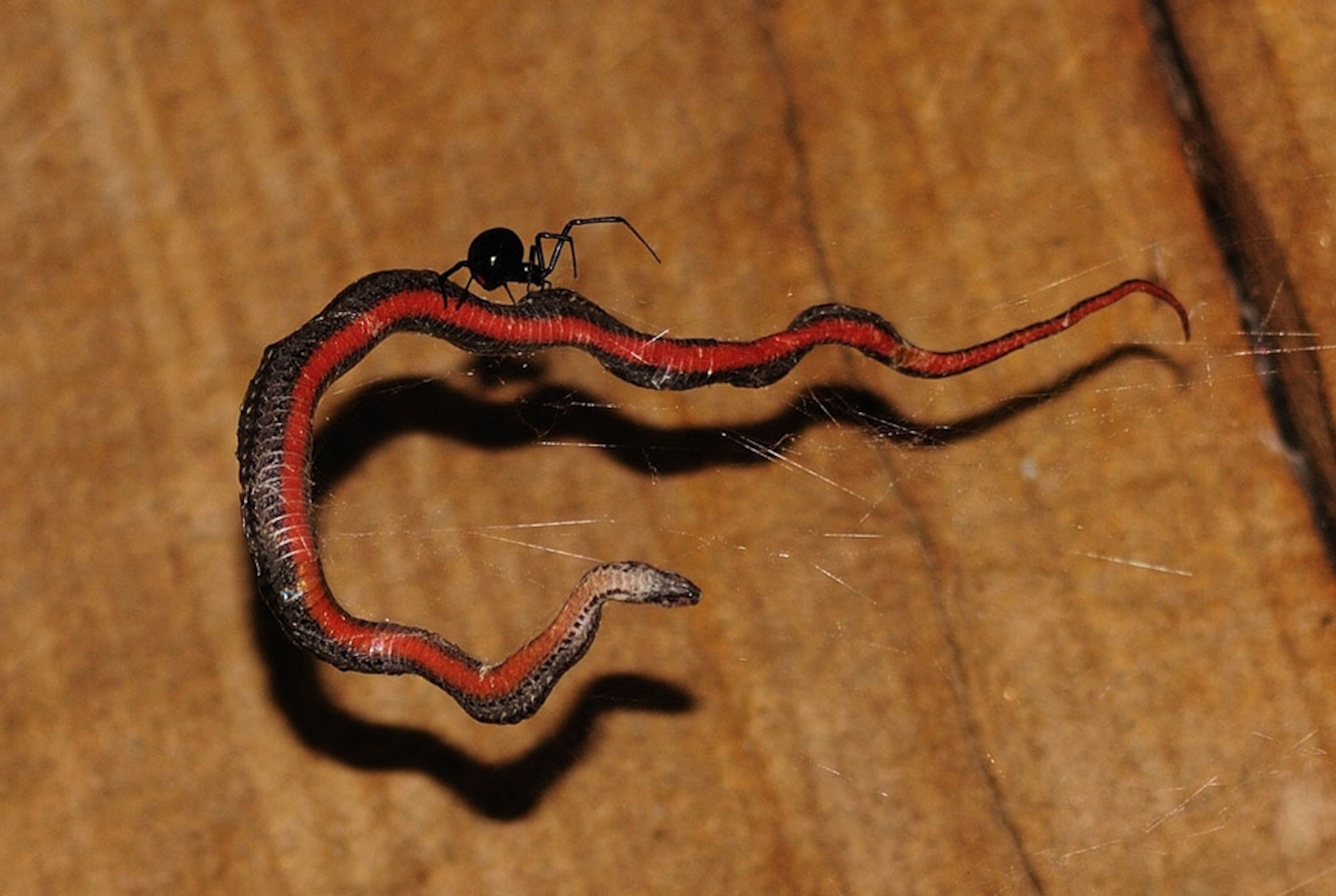 This mash-up is on my mind thanks to this Nat Geo story by Jason Bittel, which reveals that scientists have identified at least 40 species of spiders that prey on at least 90 species of snakes, on every continent except Australia. (Pictured above, a spider preys on a snake in Peru’s Amazon rainforest; below, a black widow predator in West Virginia.) Spiders eating snakes is far more common than anyone realized, and it has all sorts of implications for how we understand ecosystem health, snake conservation, and spider behavior.
