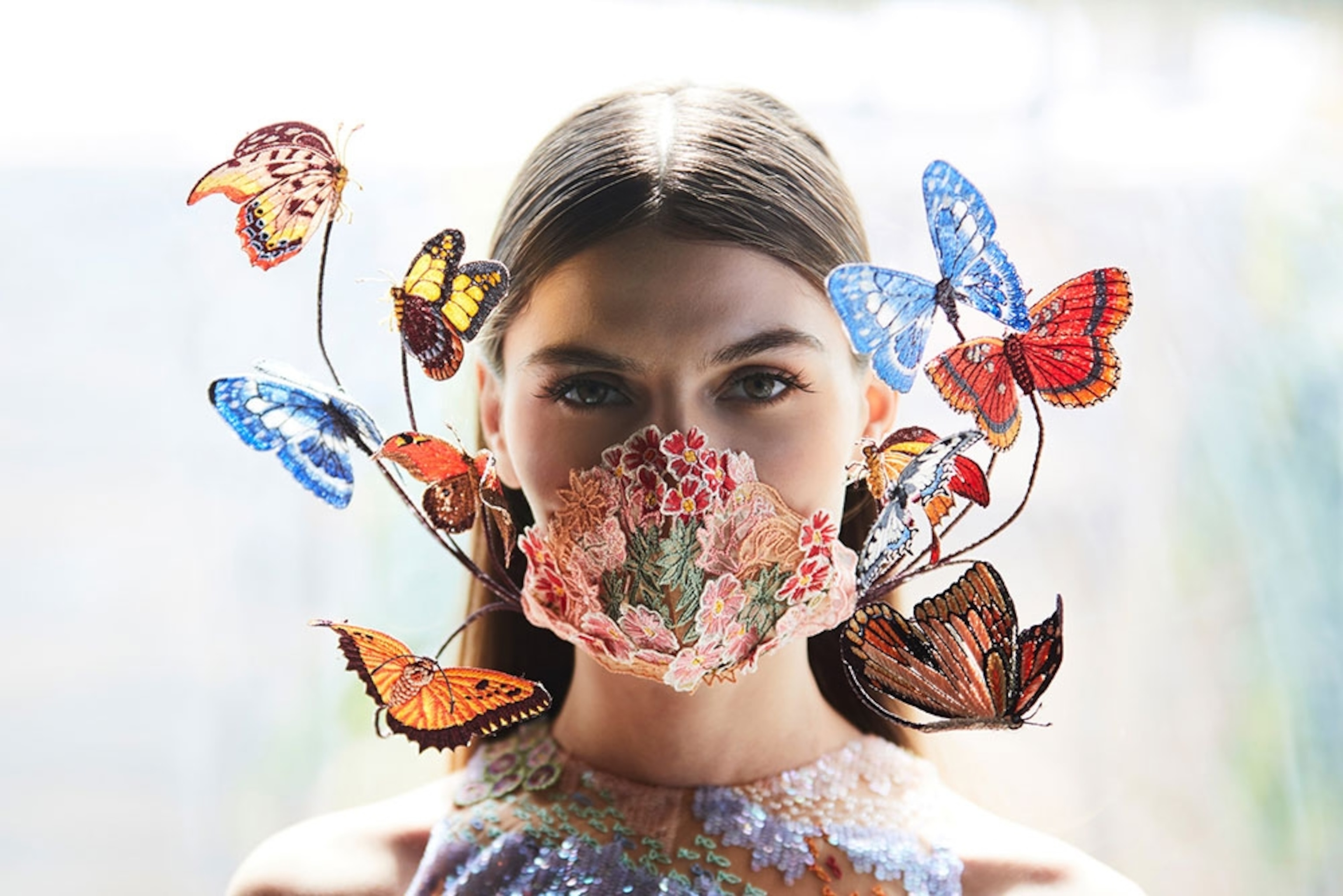Pictured at top, masked women depicted in a pilgrimage in a 1601 painting; above, “Butterfly People,” by Indian designer Rahul Mishra, is among a virtual exhibition of more than 100 contemporary face masks from around the world, Nat Geo reports.