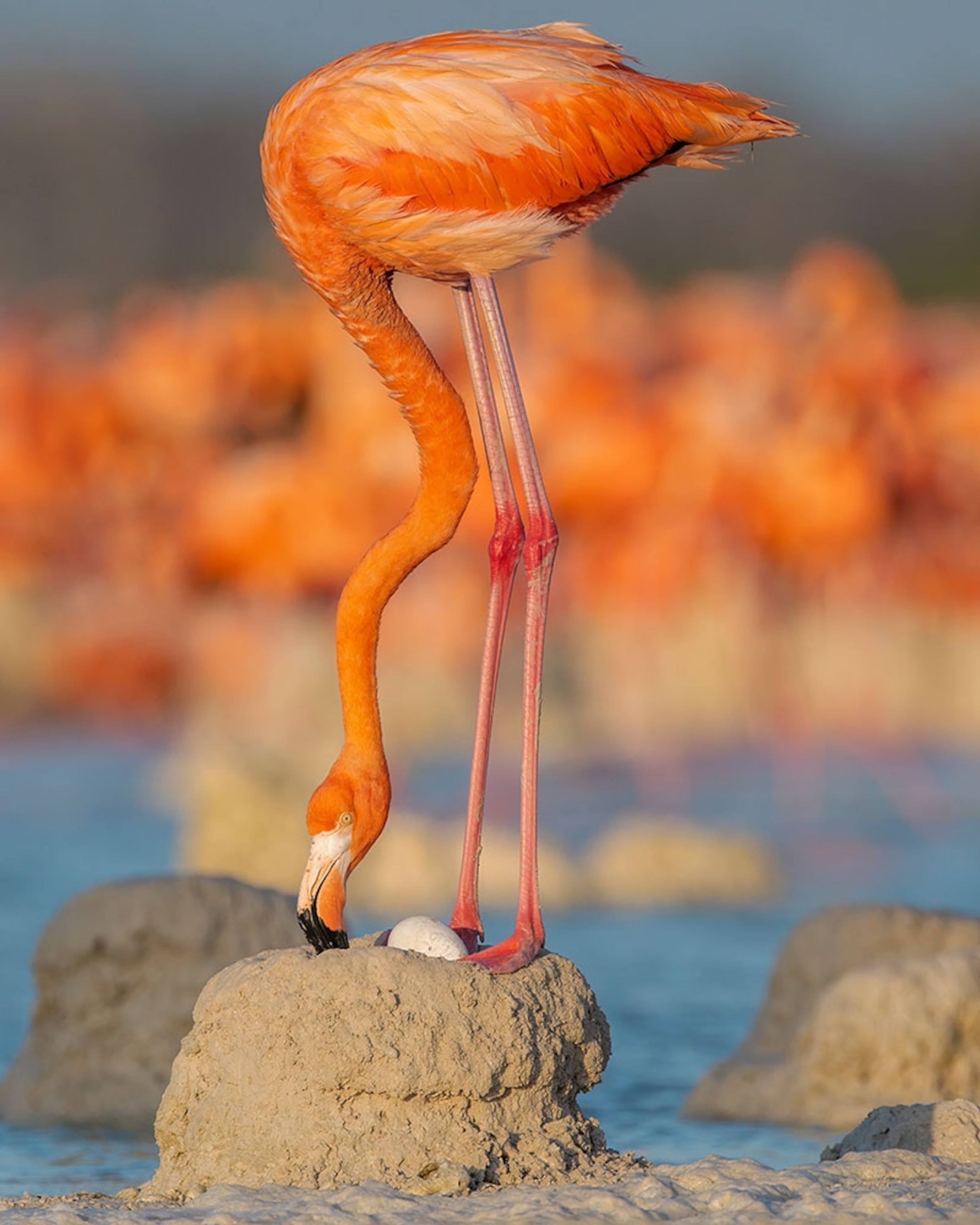 Shared parenting: An American flamingo carefully turns its egg with its bill. Flamingos usually lay one egg each year, which males and females take turns incubating for 27 to 31 days. “During this period, I saw flamingos frequently stand up to take care of their egg and also to preen themselves,” says Hao Jiang, Nat Geo’s Your Shot Photographer of the Month for June. “This image was taken very carefully, with the park rangers, without disturbing the birds in this restricted nesting site in Yucatán, Mexico.”