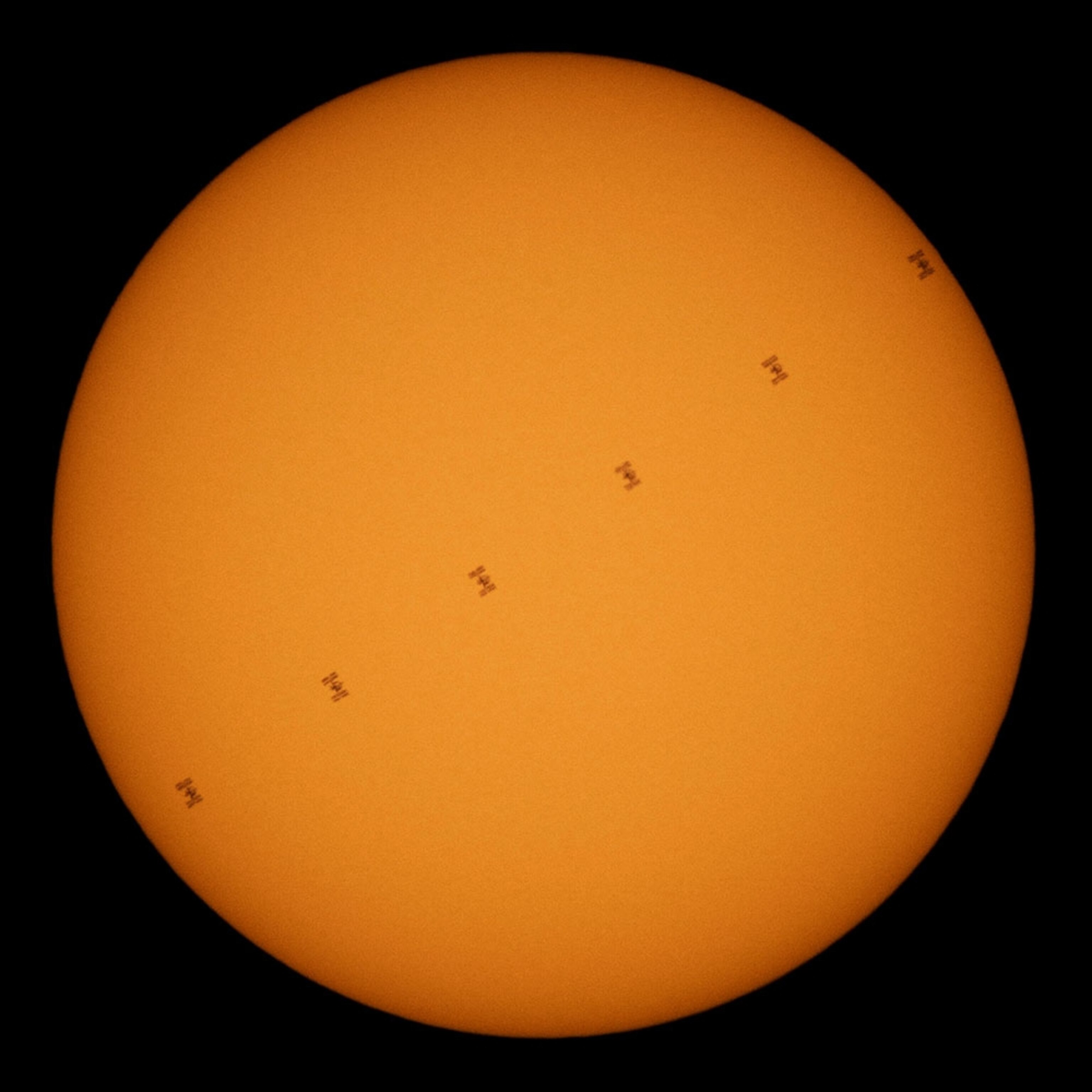Working together for two decades: A march of black dots against a glowing disk, the International Space Station transits the sun in this composite image taken from Virginia. On November 2, the ISS celebrated 20 continuous years of human habitation, a milestone of human space exploration.
