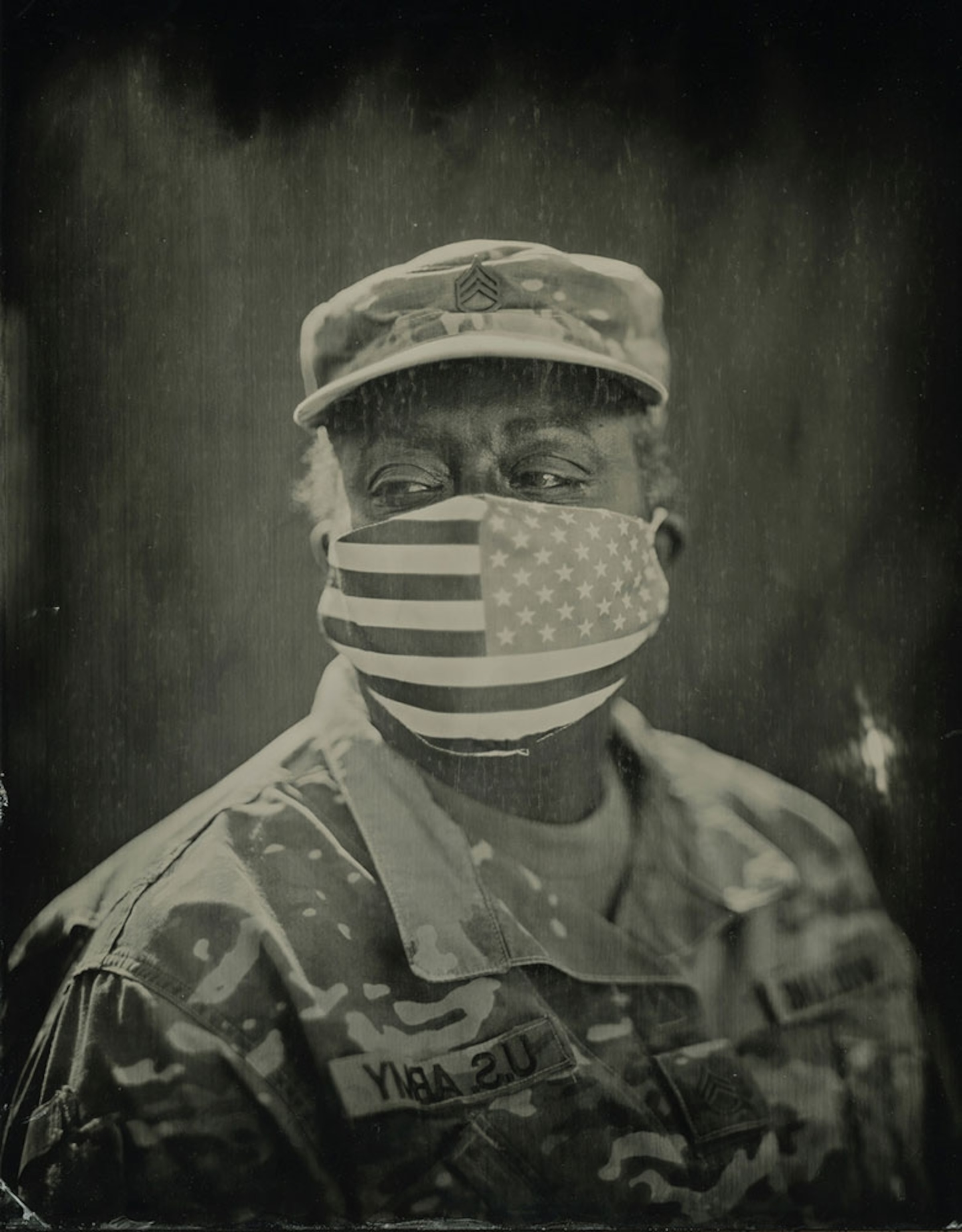 A cousin, a symbol: Photographer Rashod Taylor says he was honored to photograph two of his cousins in uniform for a Nat Geo story on Black military families. Above is Staff Sergeant Vanessa Lewis Williams of the Georgia Army National Guard as she sits for an old-timey tintype portrait. “I use the wet plate collodion process to bridge the past to the present,” he says. Williams and her sister, combat veteran Valerie E. Lewis, share their stories on being deployed, serving in the same unit, and their experience as women in the military for an upcoming story.