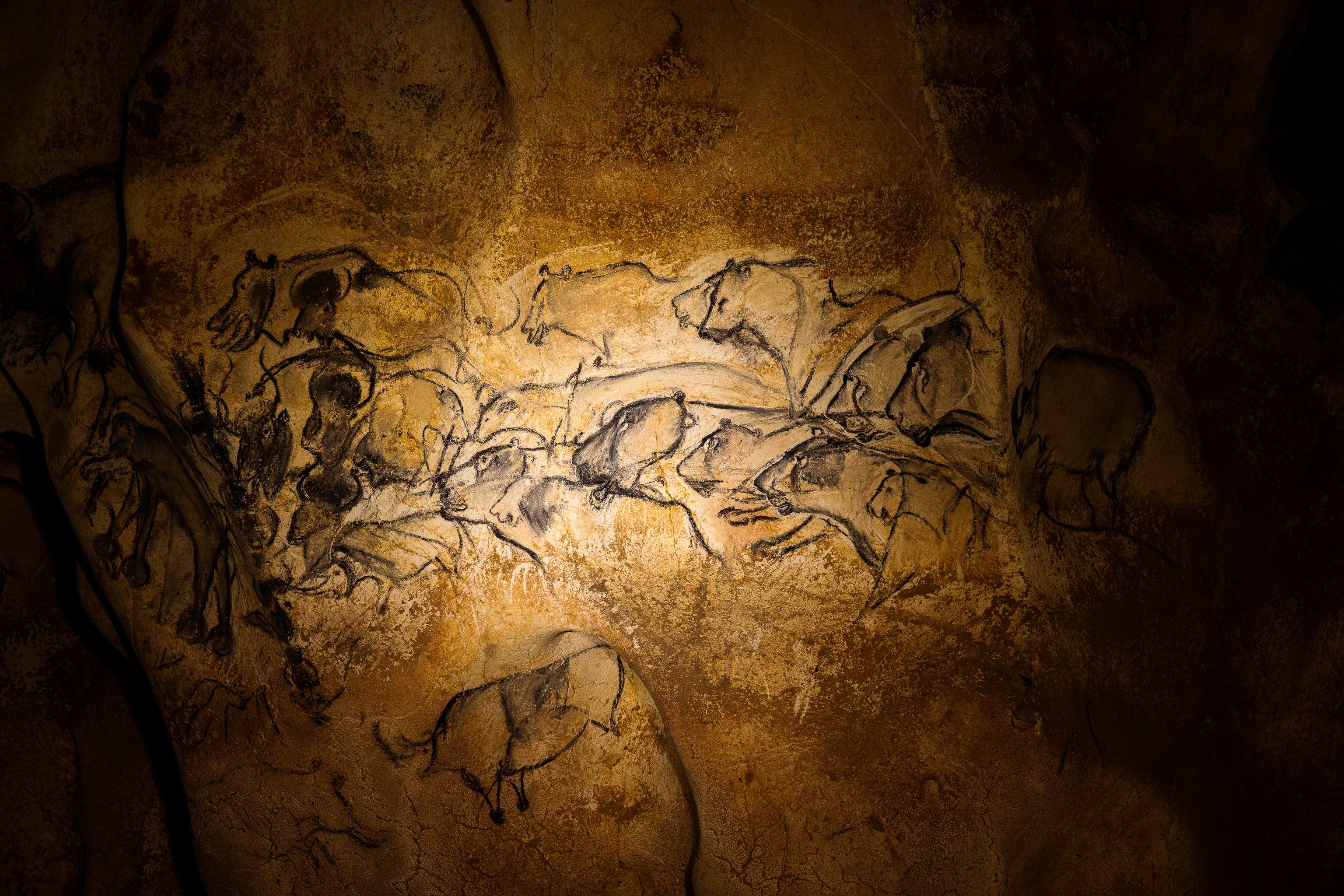 Recording a lost world: The 36,000-year-old paintings in France's Chauvet Cave, remarkably preserved, tell stories of when lions, aurochs, bison, and rhinoceroses all lived in Europe. Sometimes the animals came even closer: The wall is covered by scratch marks from bears (Ursus spelaeus), which hibernated in the caves.