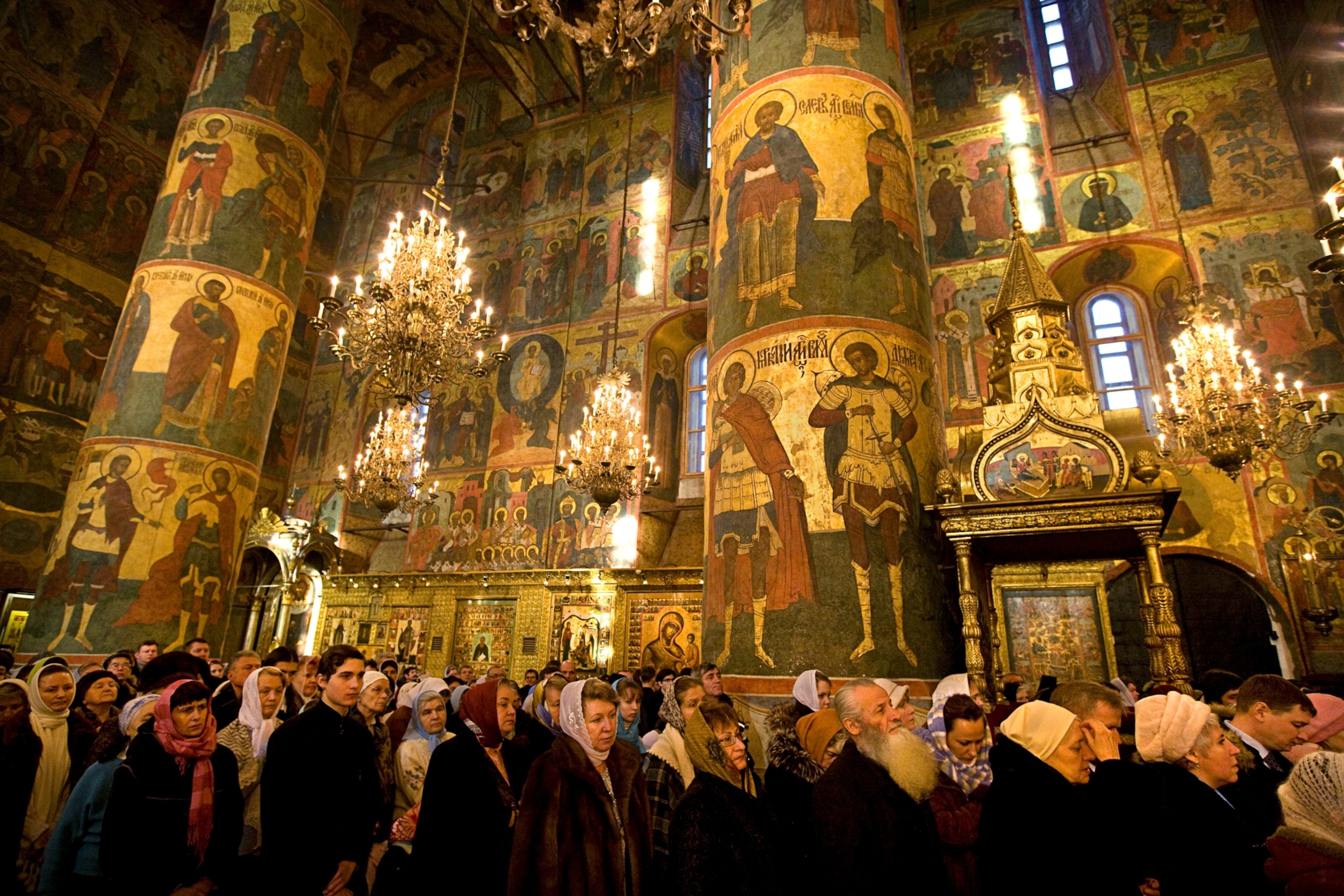 In exaltation: Emperors once worshipped and tsars were once crowned beneath these resplendent icons of saints at the Assumption Cathedral in Russia’s Kremlin. Photographer Gerd Ludwig captured a Mass at the restored 15th-century cathedral, which is the historic seat of the Russian Orthodox Church and became a museum during the communist era.