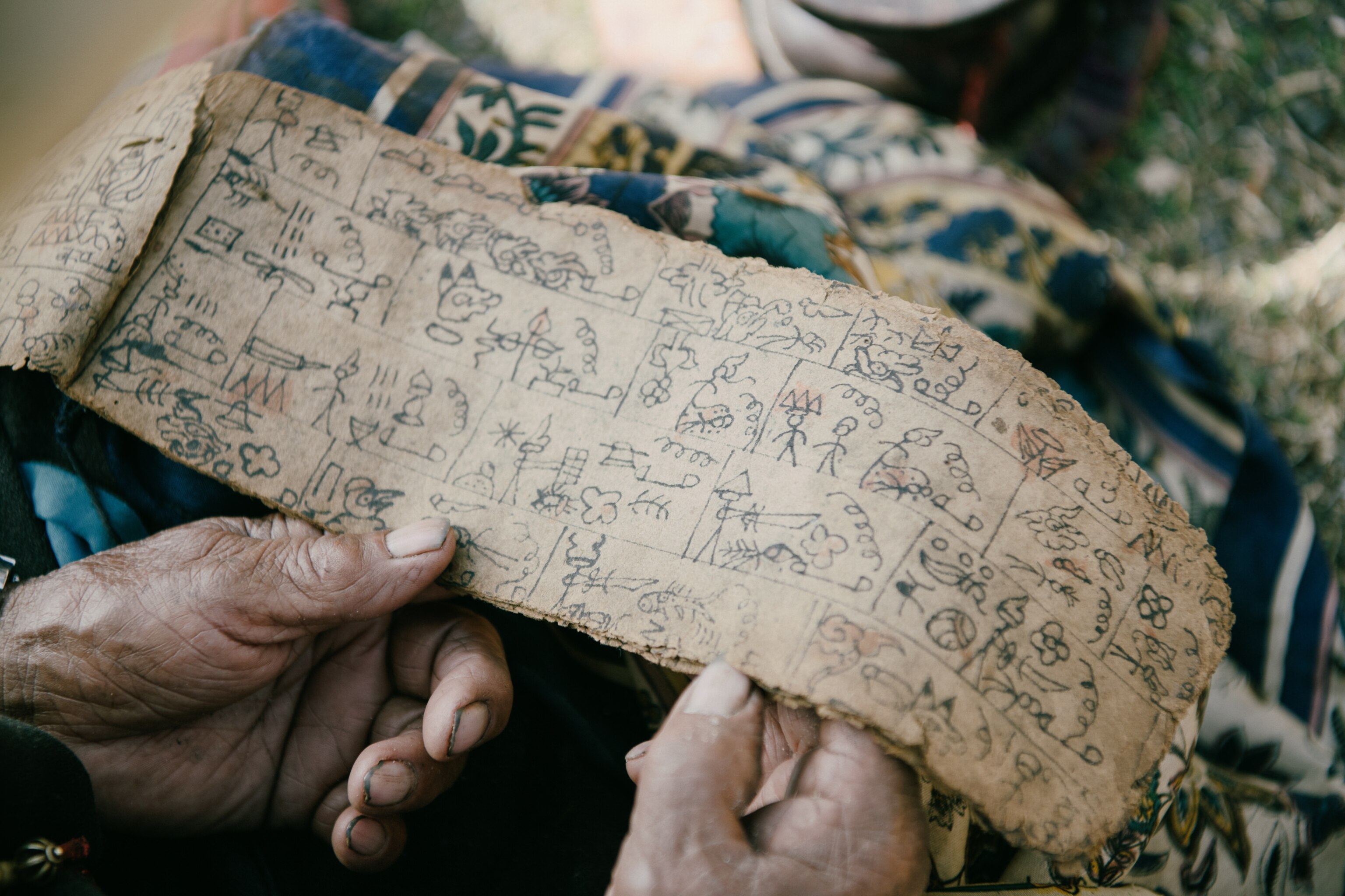 From image to speech: A shaman of the Naxi Indigenous people in southwest China, Za Shi Duzhi, prepares for a healing ceremony by reading a shamanic text, written in Dongba. The pictographs act as mnemonics, to help the shaman remember the sequence of events and the meanings of rituals. Dongba is the only remaining pictographic system in use throughout the world.