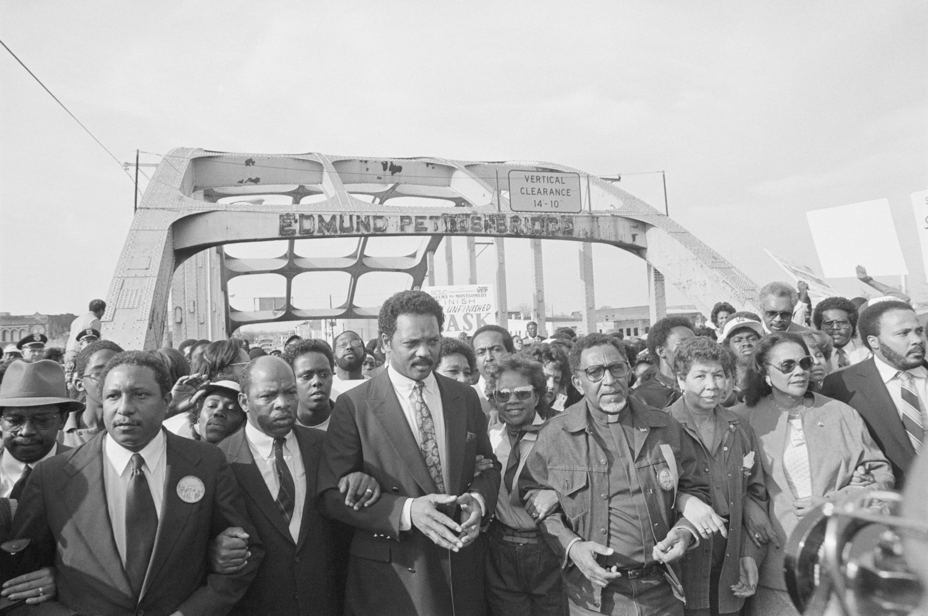 Yes, it might erase a stain on American history to rename Selma, Alabama’s Edmund Pettus Bridge from a former Ku Klux Klan grand dragon to Rep. John Lewis, who was beaten to near death there on a 1965 march to allow America’s rights for all. (Pictured above, Lewis with the Rev. Jesse Jackson and other civil rights leaders on a reenactment of the march in 1985).