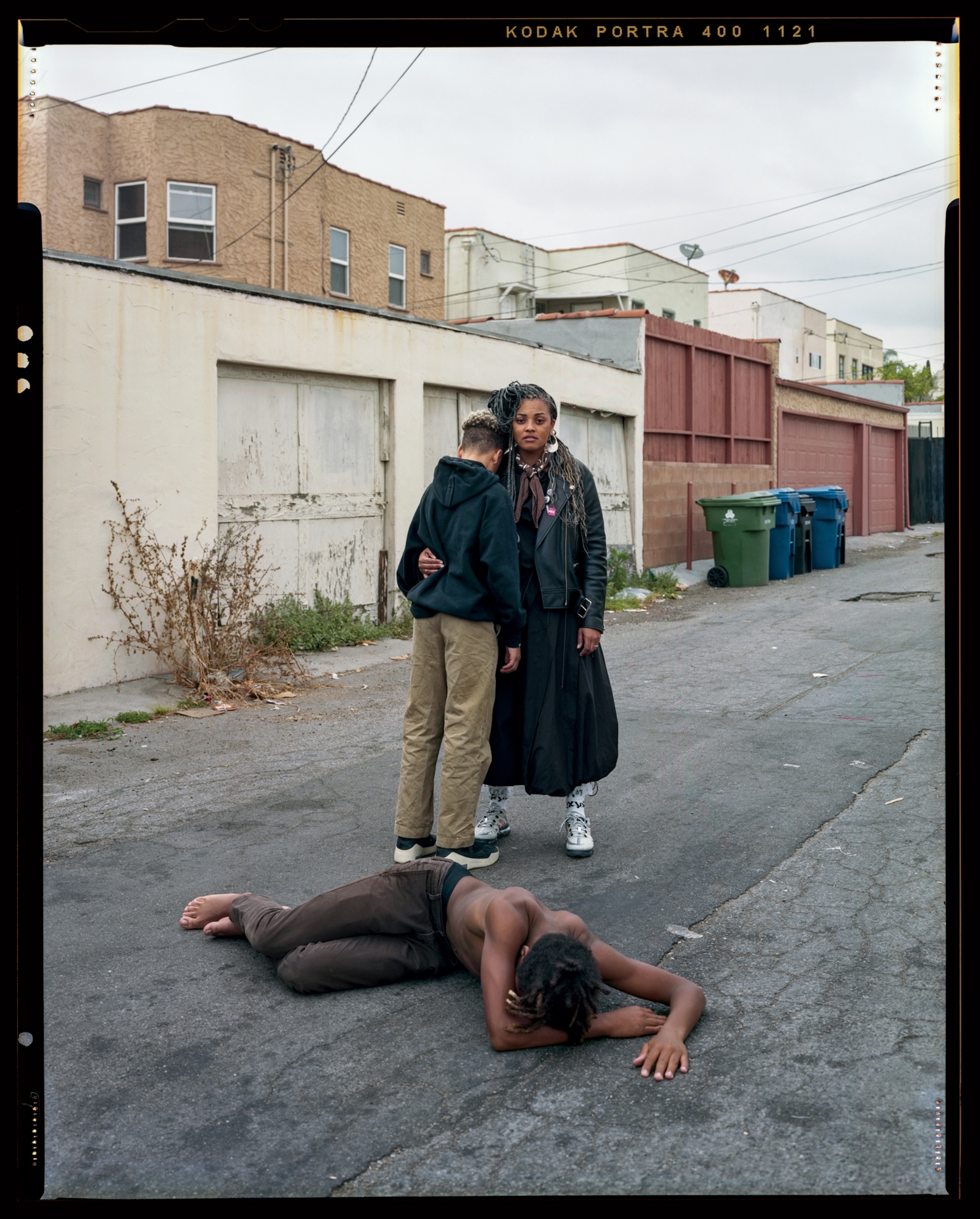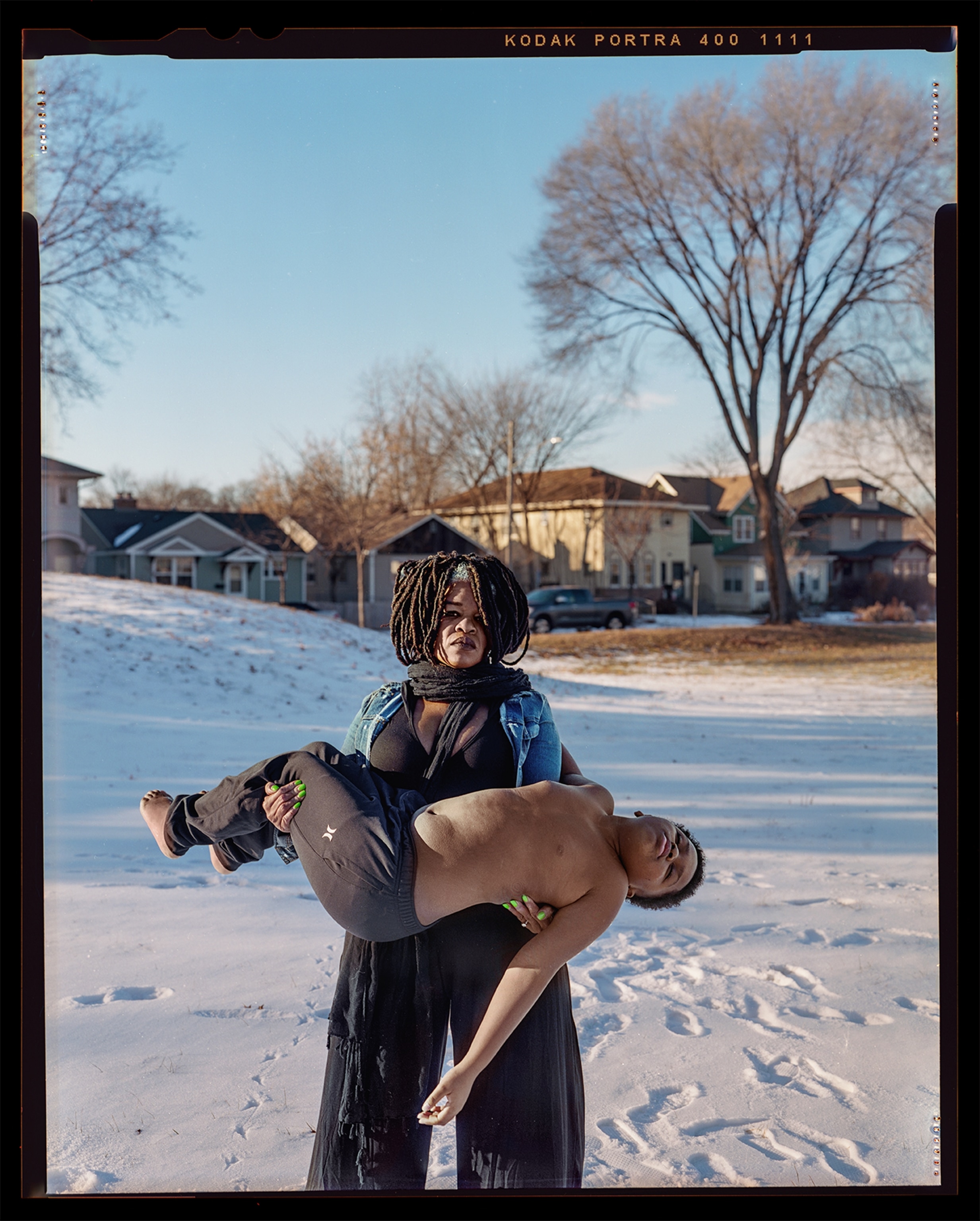In the series “Stranger Fruit,” Henry examines police killings of Black men and boys. He poses Black mothers with their sons in the classic pietà, a grieving Mary holding the dead body of Christ. (Pictured above, on Chicago’s Magnificent Mile.)