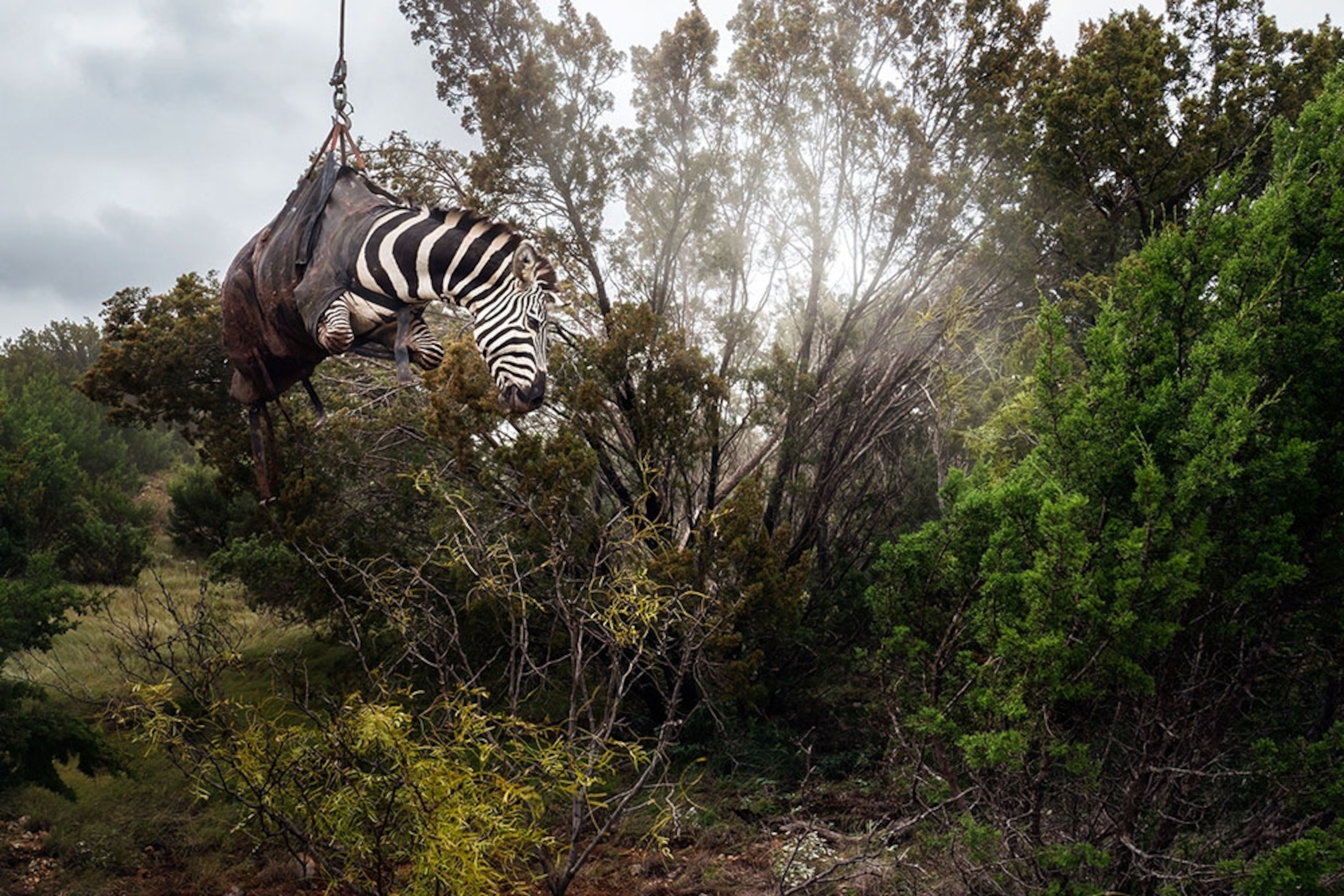 Transporting a zebra: A sedated zebra is lifted by a helicopter at a ranch called Sexy Whitetails, near San Angelo, Texas. The wildness and heft of exotic hoofed wildlife make them difficult to corral and move, which has led to a lucrative subsector: transportation.