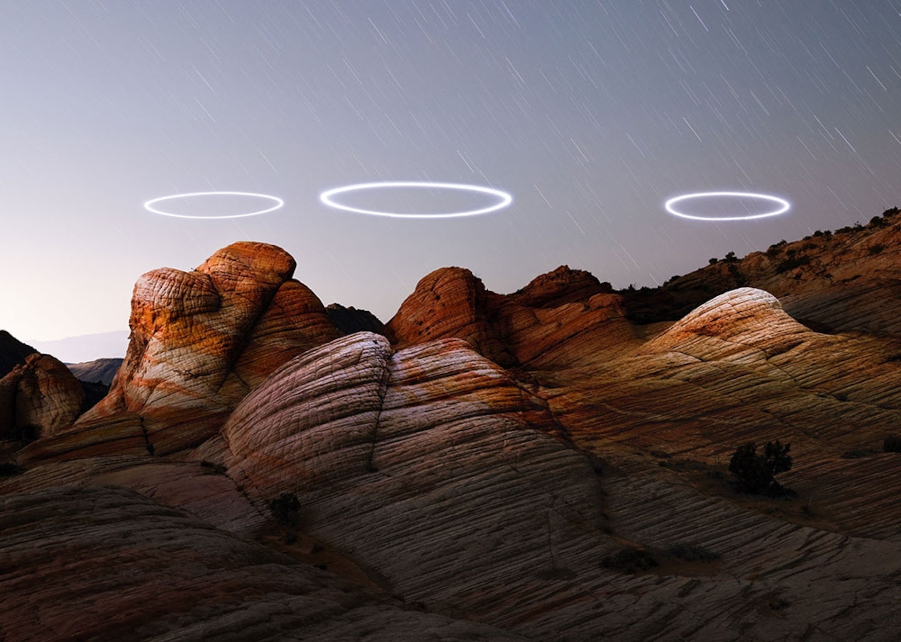 And the halos: Photographer Reuben Wu programmed lit drones to circle above Utah’s Yant Flat sandstone formations, then combined several long exposures into this composite image. The effect? A bit of wonder.