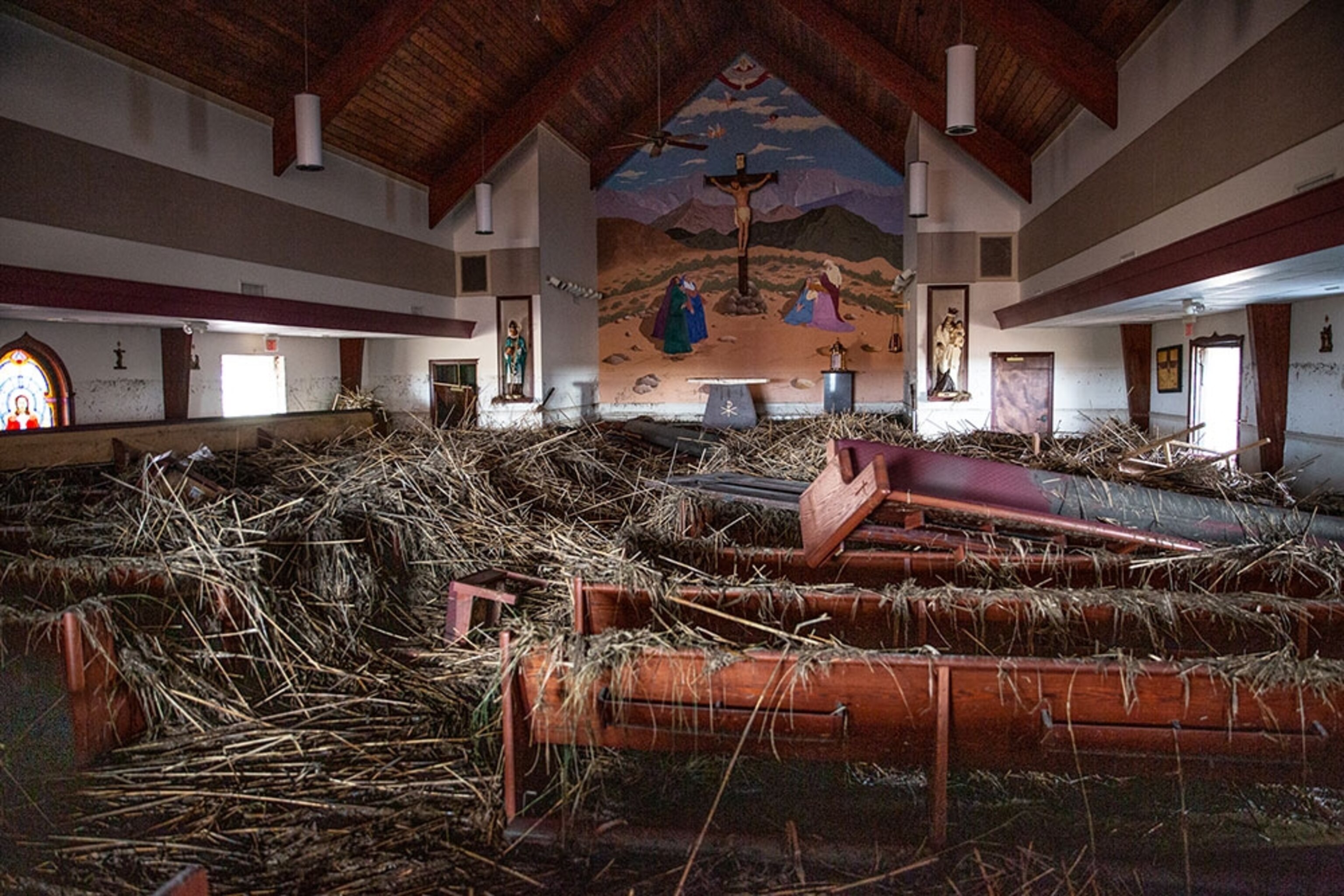 The mural behind the altar was spared: Marsh cane and mud from Hurricane Laura’s storm surge were strewn across the pews of St. Eugene Catholic Church in Grand Chenier, Louisiana. As the land sinks and seas rise in Louisiana, the waters of the Gulf of Mexico are seeping closer and closer to communities.