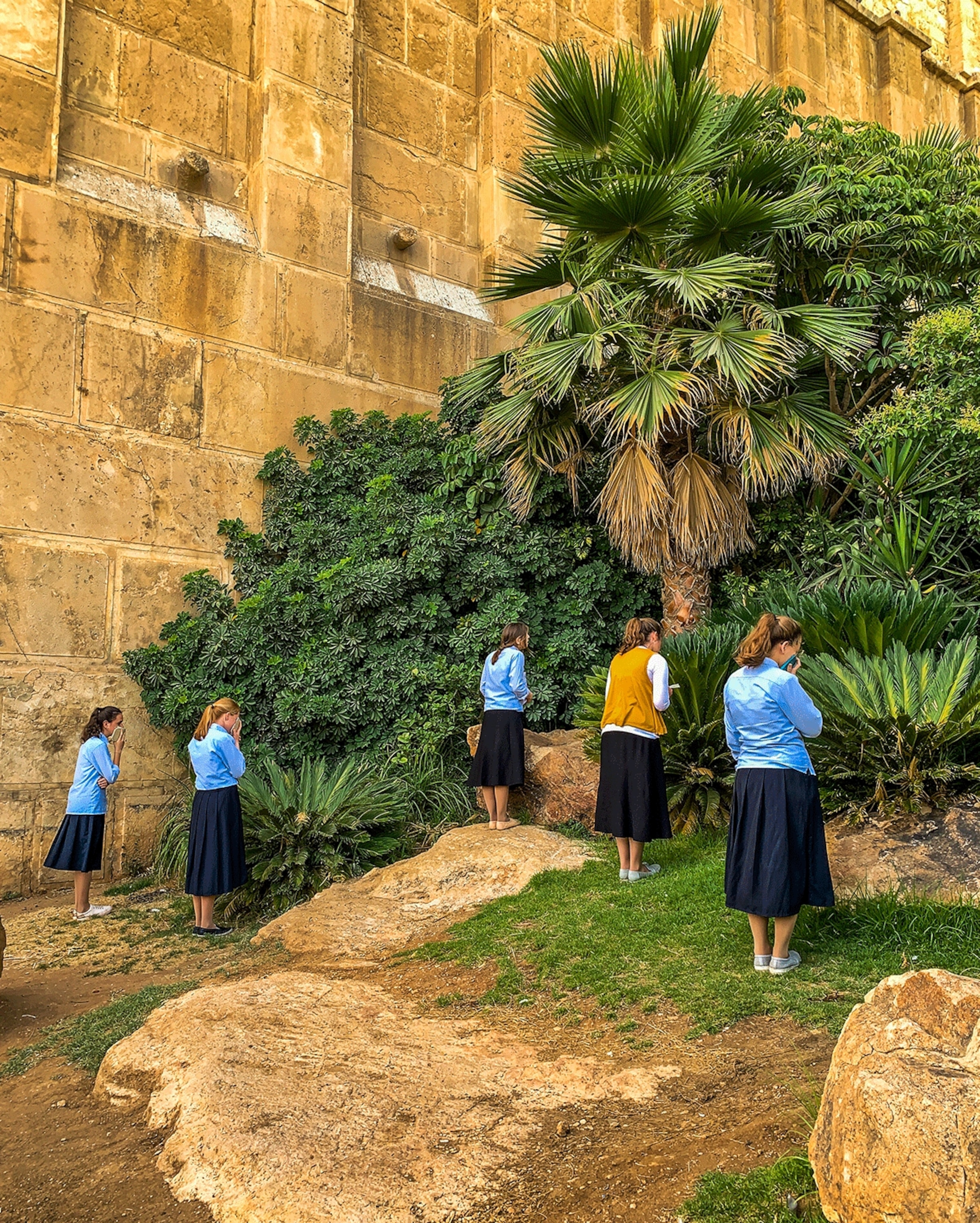 Holy: Young Jewish girls pray outside the Cave of the Patriarchs, located in the old city of Hebron. Revered by both Jews and Muslims, the site is believed to be the oldest continuously used intact prayer structure in the world, containing the burial sites of the Patriarchs and Matriarchs of the Jewish People. According to the Abrahamic religions, the cave and adjoining field were purchased by Abraham as a burial plot. Known to Jews as the Cave of Machpelah, the site is considered by Jews to be the holiest place after the Temple Mount in Jerusalem.