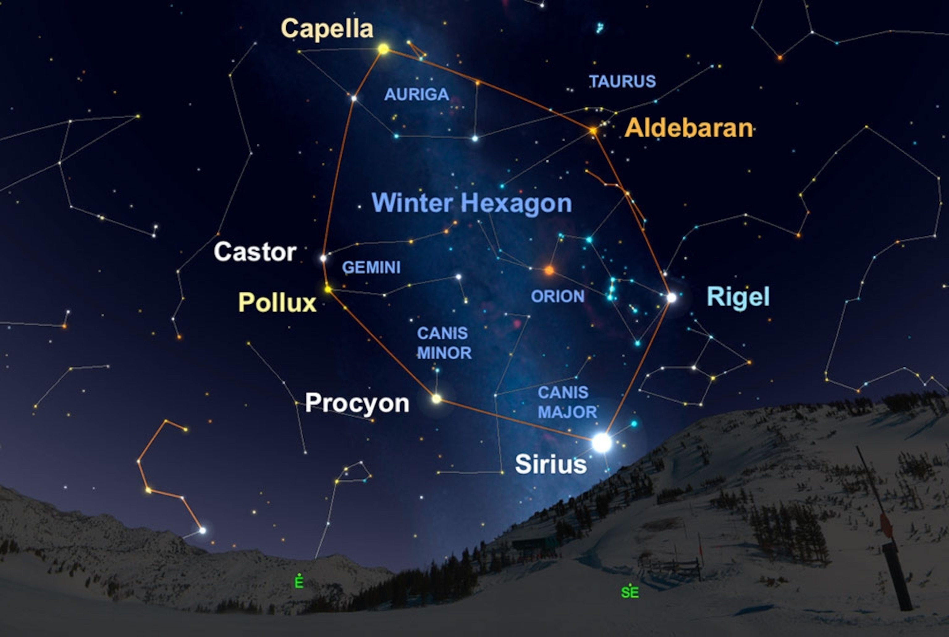 Winter Hexagon: One of the sky’s largest asterisms—a recognizable pattern of stars separate from a constellation figure—dominates the eastern sky this time of the year. The Winter Hexagon can be traced starting with Orion’s blue-white luminary, Rigel. From there, make a clockwise hop to Sirius in Canis Major, then glide over to Procyon, the lead star in the constellation Canis Minor. Next up are the equally bright twins Castor and Pollux of Gemini fame, followed by Capella shining with a hint of golden-yellow in Auriga.—Andrew Fazekas
