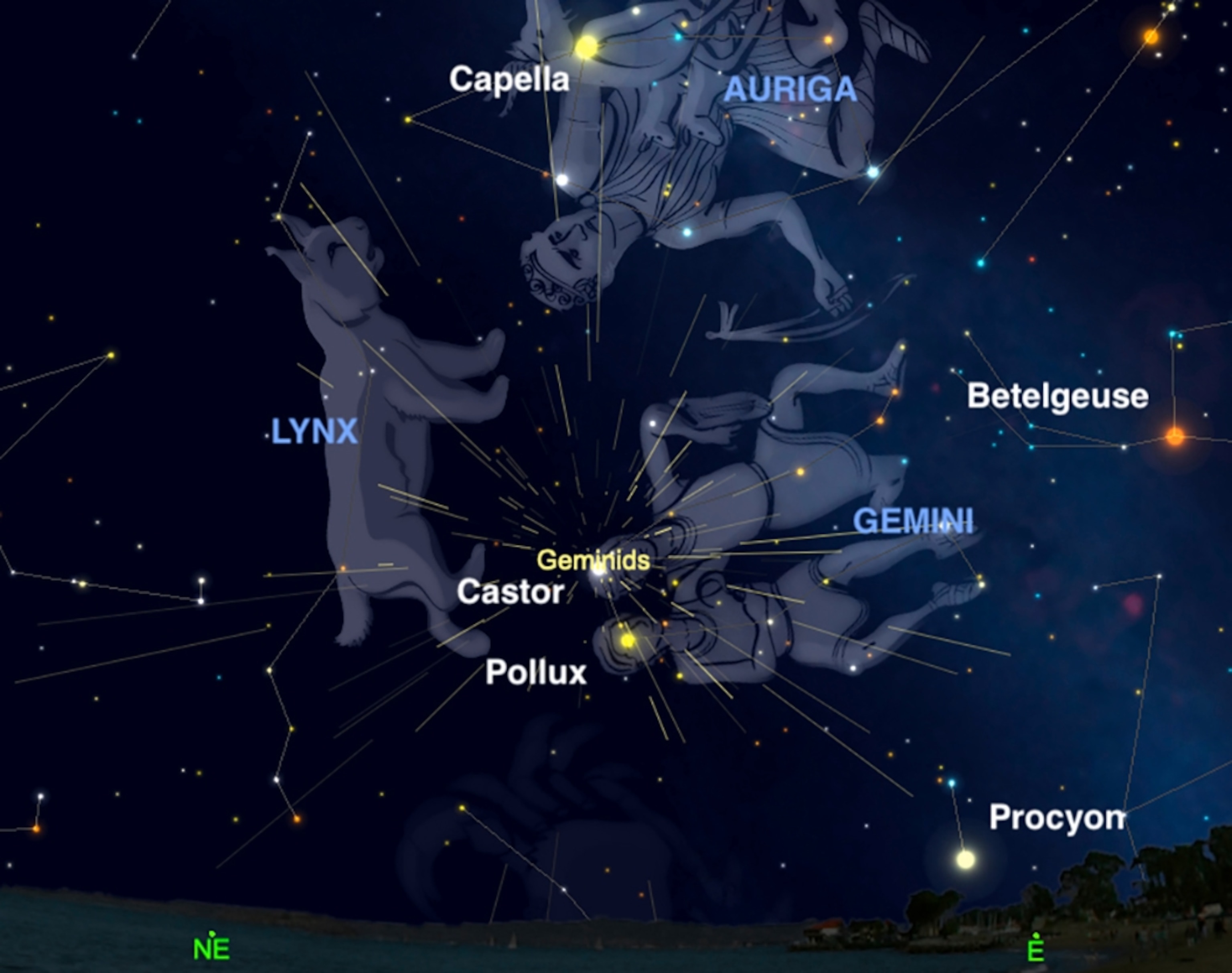 Best meteor shower of the year? Late Sunday, look toward the northeast for the annual Geminid meteor shower to kick into high gear. With the moon out of the sky during peak hours, even faint meteors may be visible. The Earth will plow into the thickest part of a cloud of debris left by an asteroid named Phaethon from late Sunday night into pre-dawn Monday, producing from 60 to 120 shooting stars per hour. That’s a lot of wishes to make! If you’re up at dawn Saturday, you’ll see the crescent moon sliding by super-bright planet Venus. On Monday, a stunning total solar eclipse graces skies along a narrow strip across central Chile and Argentina, while most of South America can see a partial solar eclipse.— Andrew Fazekas