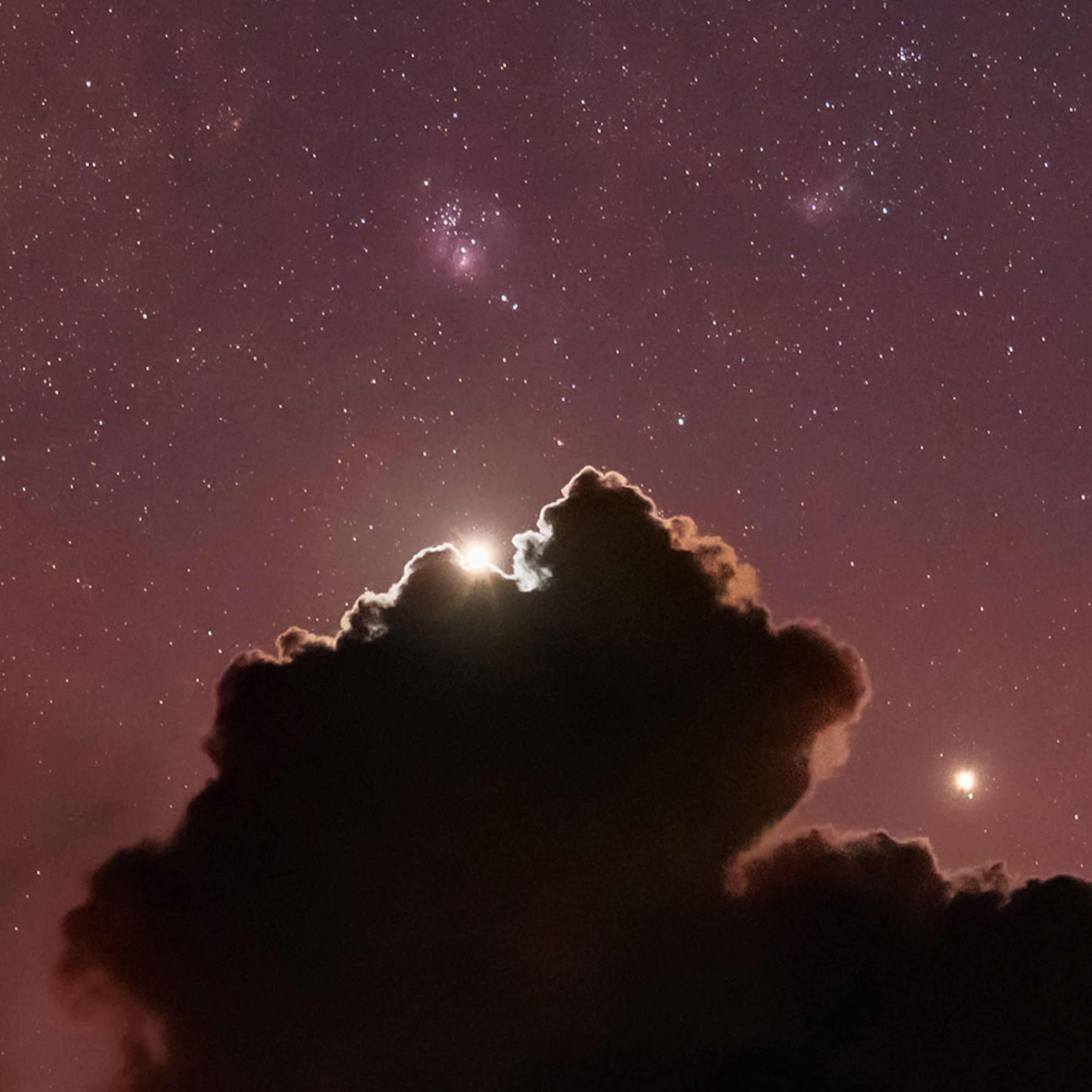 Hello there: This close-up view shows a celestial meeting of the two brightest planets visible in Earth's sky. On this late November evening, Venus and Jupiter are seen next to the Lagoon Nebula, 4,100 light-years away in the galaxy. Photographer Babak Tafreshi, in Guatemala, captured the vivid colors of dusk in this tropical latitude before the planets disappeared behind towering cumulus clouds.