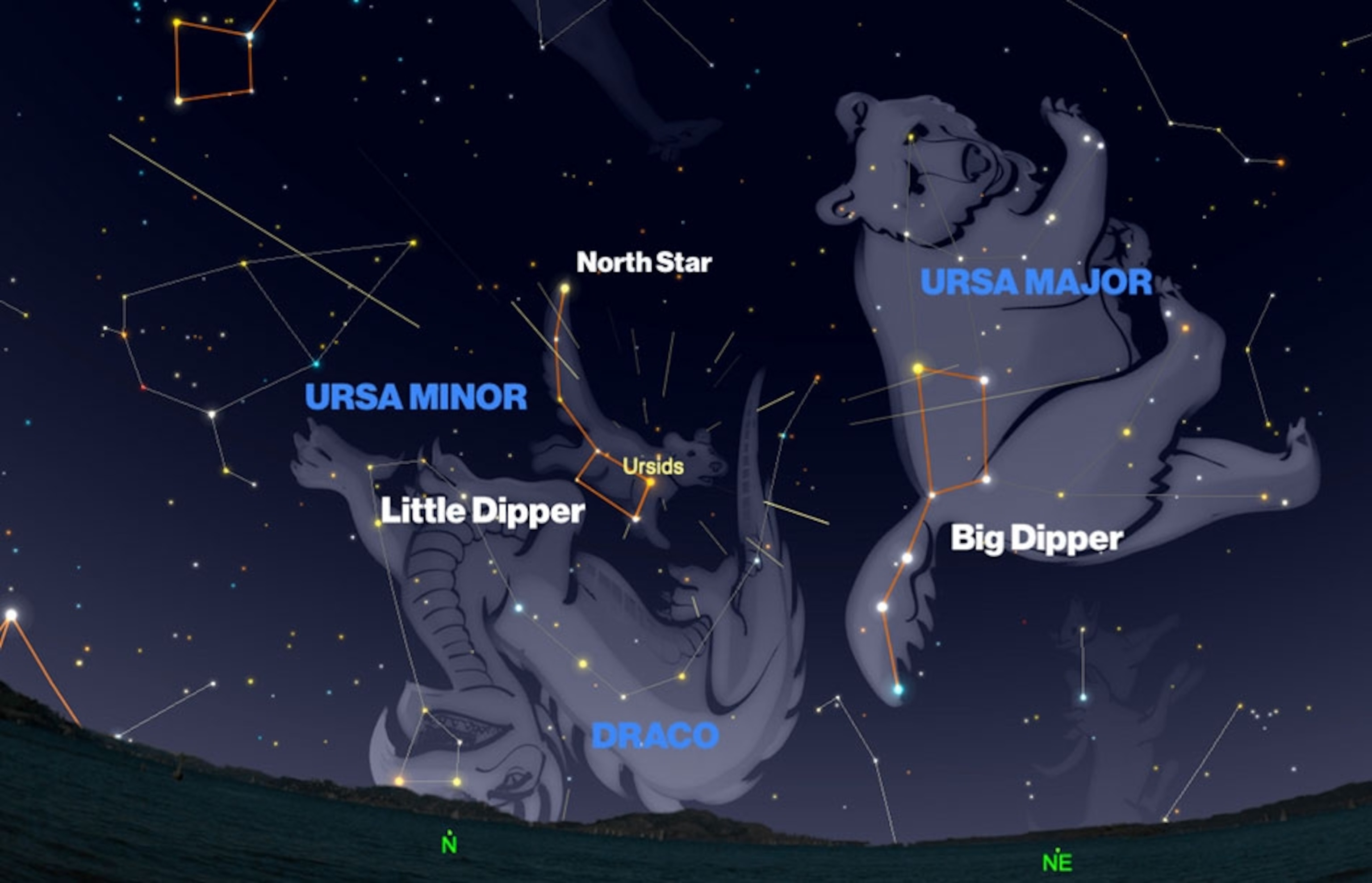 Little Bear meteors fly. With only a crescent moon to contend with this weekend, the Ursid meteor shower may fare better than the Geminids last week, which was a washout because of the blinding glare from a nearly full moon. The Ursids are named after the constellation from which they appear to radiate—in this case Ursa Minor, the little bear, a region of sky just above the bowl of the Little Dipper. While the Little Bear shower normally only produces about 10 shooting stars an hour, experts predict that we may be in for an outburst this year, with estimated rates of up to 30 meteors an hour before dawn on Sunday. —Andrew Fazekas