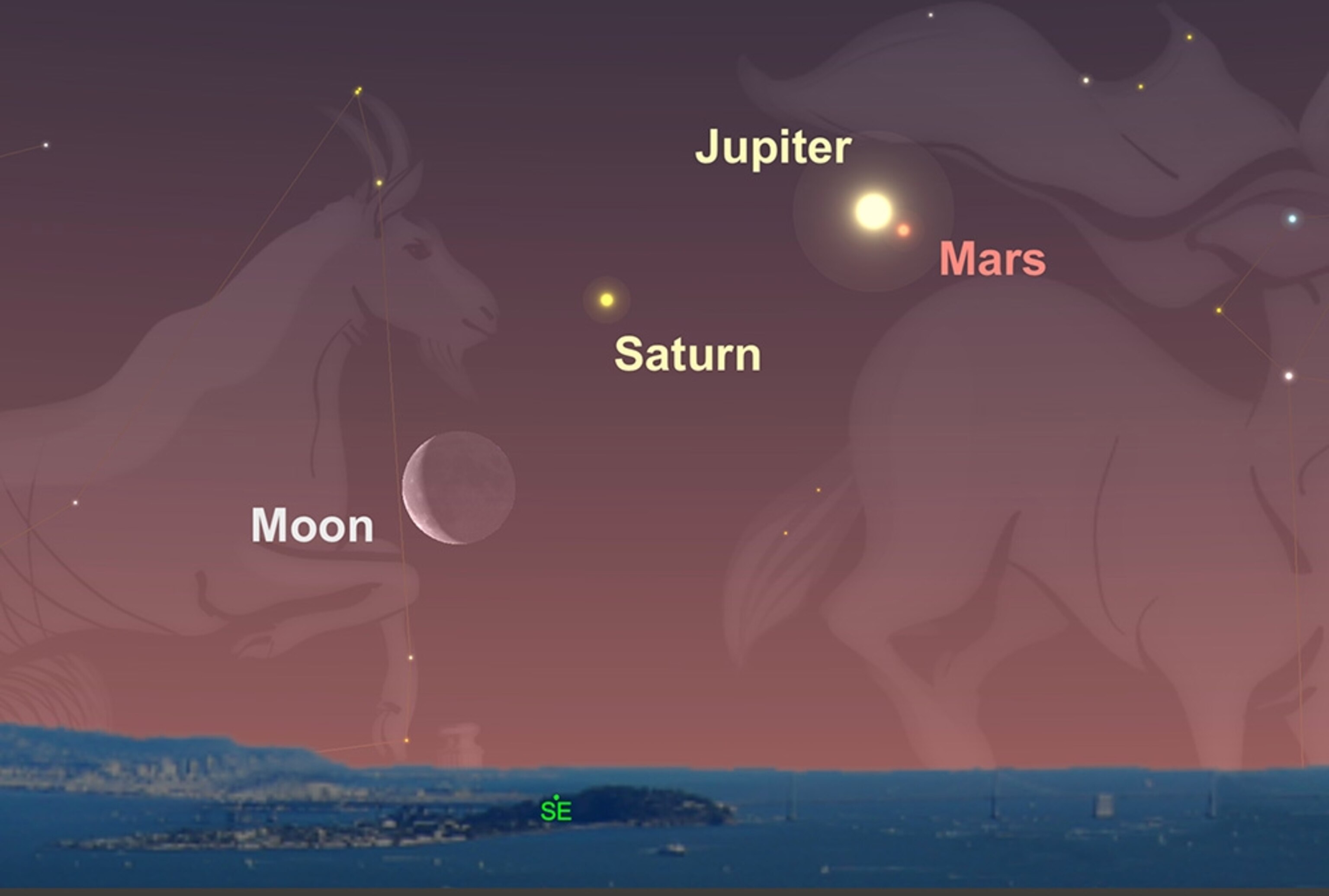 Jupiter drops: Early risers looking toward the east at dawn Thursday can catch sight of the waning crescent moon pairing with Saturn. This is a great opportunity to check out the gas giant’s famous rings with a small telescope. At dawn on Friday, look for faint Mars to join super-bright Jupiter. The apparent space between the two worlds will be a bit wider than the disk of the full moon, and the ruddy color of Mars will contrast with Jupiter’s creamy color. All week long, sky-watchers in the dark countryside across the Northern Hemisphere can look for zodiacal light. This pyramid-shaped beam of light is visible about an hour after sunset above the western horizon. It is caused by sunlight reflecting off cosmic dust. —Andrew Fazekas
