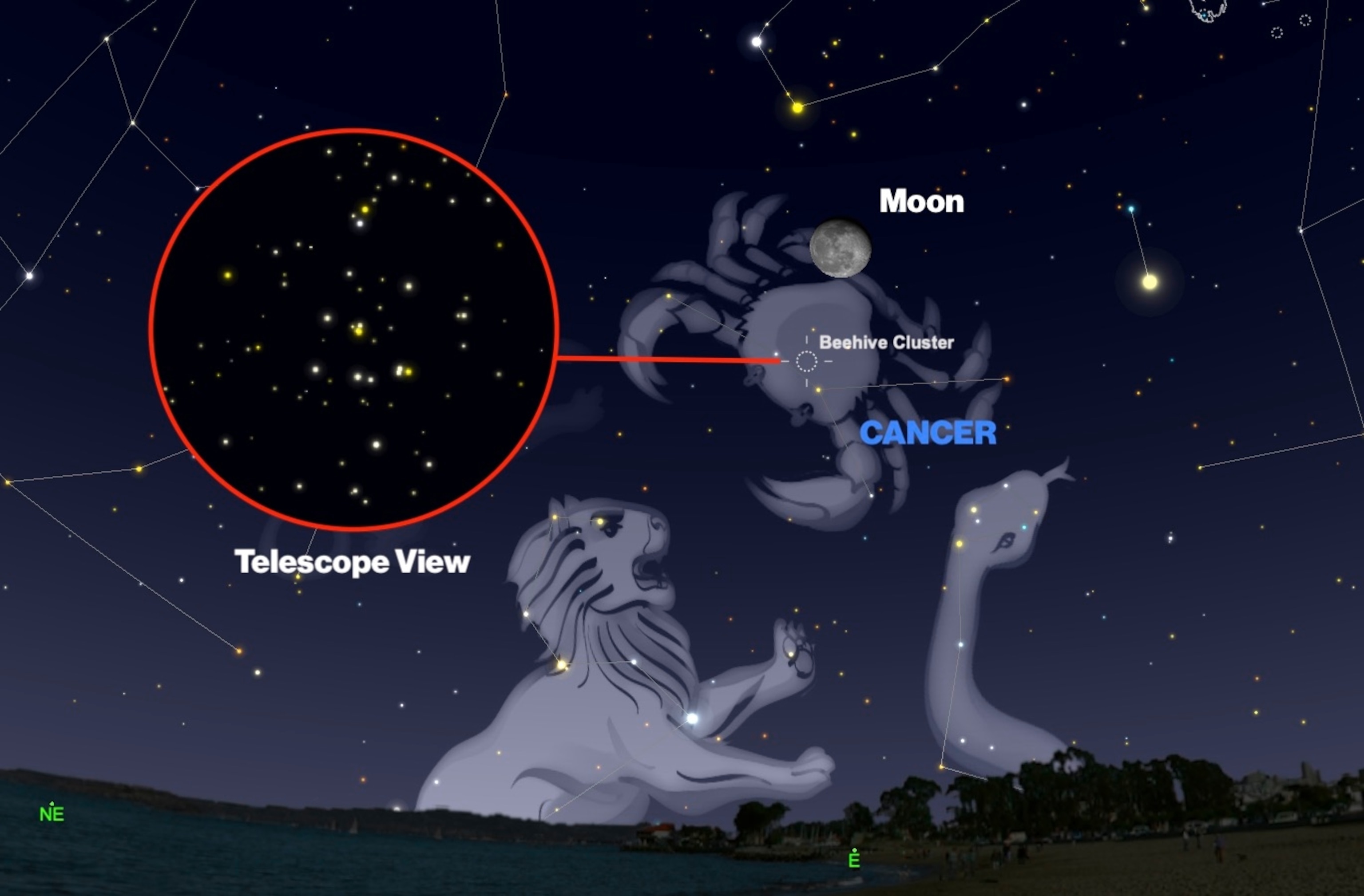 Moon buzzes the Beehive: After dark on Saturday, look in the eastern sky for the waning gibbous moon, which will act as a guidepost to hunt down the bright Beehive star cluster in the constellation Cancer, the crab. The Beehive will appear less than five degrees from the moon—equal to about the width of your three middle fingers held at arm’s length. Binoculars will show both the moon and open star cluster within the same field of view, but don’t let their apparent proximity to each other fool you. While the moon is only 1.255 light-seconds from Earth, the Beehive cluster with its thousand stars is nearly 600 light-years away. —Andrew Fazekas
