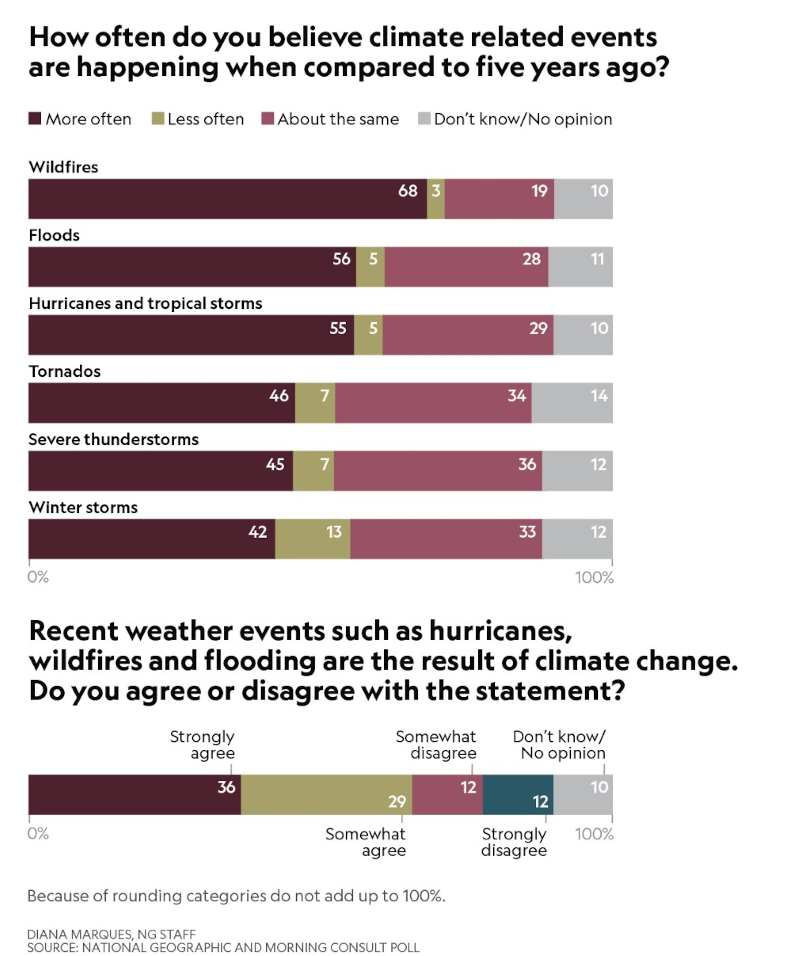 And if so, are they tying extreme weather to climate change? Those are the questions asked in a National Geographic and Morning Consult poll of 2,200 Americans. More than half of those polled are seeing more wildfires, floods, and hurricanes or tropical storms now than they did five years ago—and about two-thirds of them agree that this extreme weather is being caused by climate change. Here are the results: