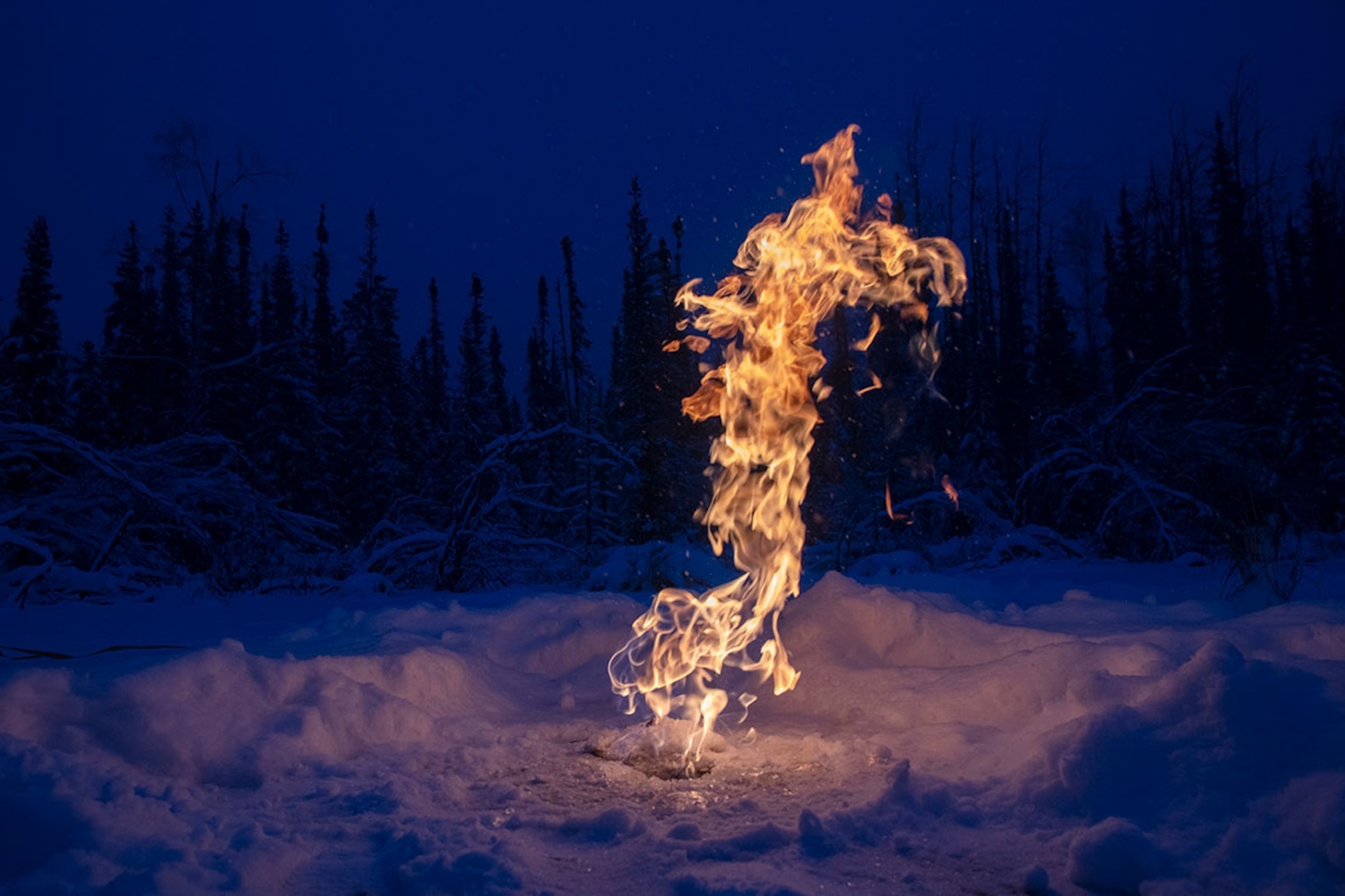 Methane lake fire in Alaska: Arctic permafrost is thawing much faster than expected, releasing carbon gases that could drastically speed up climate change. Scientists say what was once hundreds of years away could now happen in a lifetime, with permafrost thaw releasing nearly three times more greenhouse gases than expected. In this image, flammable methane, a potent greenhouse gas, bubbles from the thawing permafrost beneath a frozen lake. When you punch a hole through the ice, the gas escapes and can be measured—or set on fire—as a scientist demonstrates here.